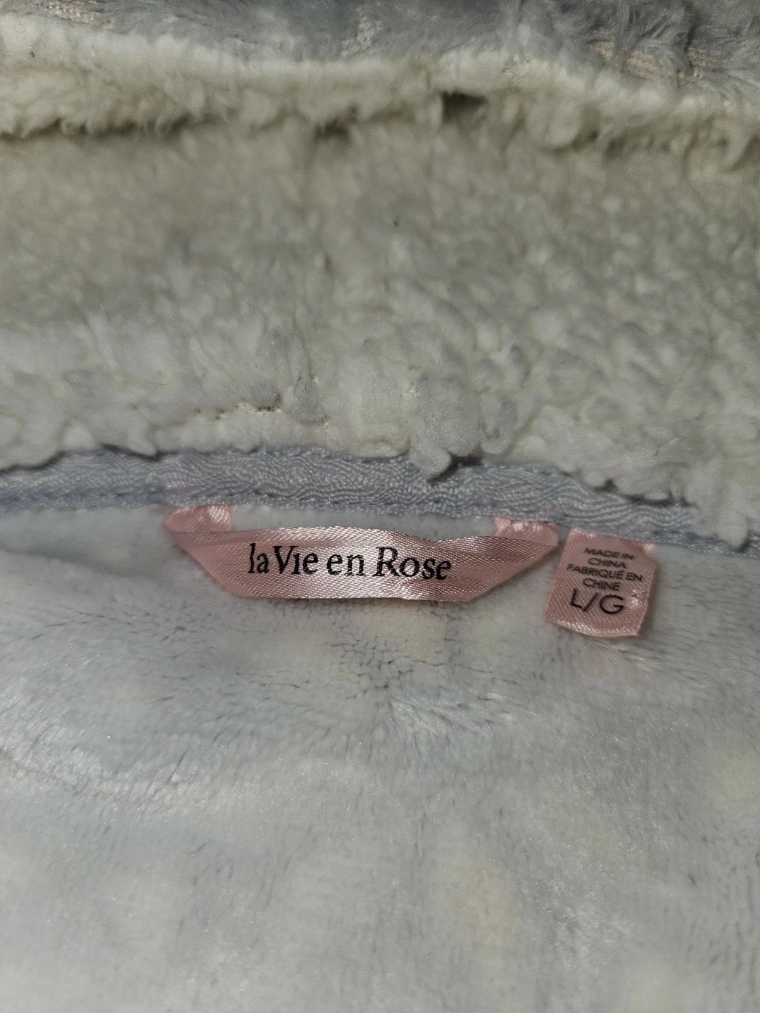 Cozy La Vie en Rose robe with a full zip front. It's a size L/G and made with soft fleece material. Features fuzzy pom-poms on the drawstrings and a sherpa-lined hood.