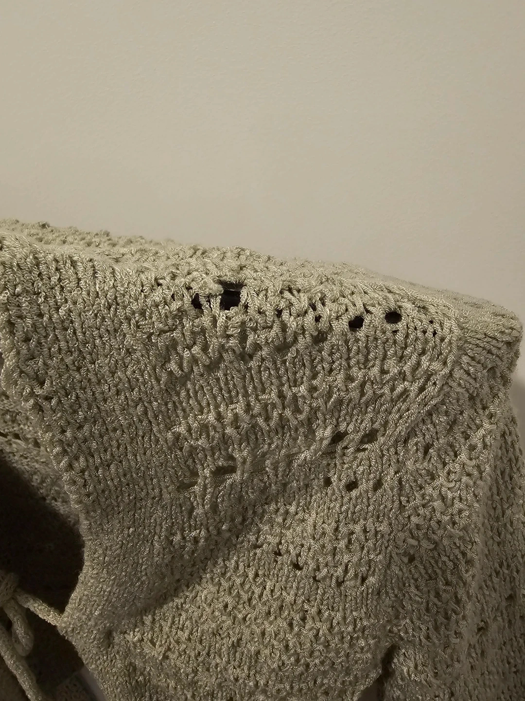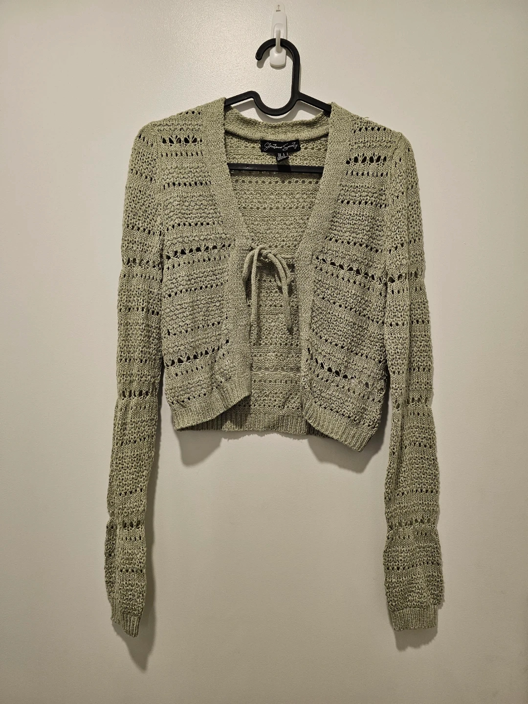 Lightweight, cropped knit cardigan from Forever 21 Streetwear Society. Features a front tie closure and a detailed open-knit pattern. Size small.