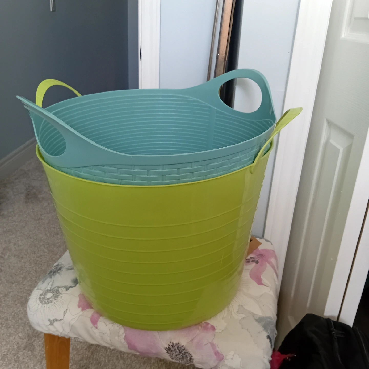 Selling two plastic laundry baskets! One is a bright green colour and the other is a nice light blue. They're in great shape and ready for a new home