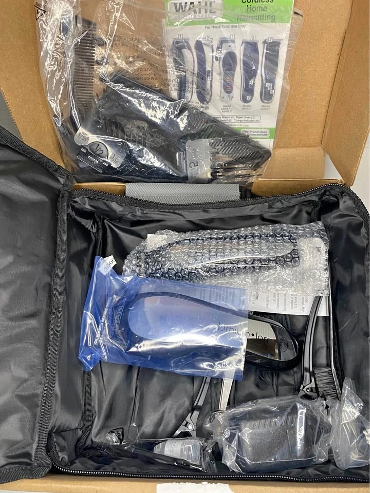 Get professional-quality haircuts at home with this Wahl Cordless Haircutting Kit. It includes a variety of comb attachments and accessories for all your grooming needs. This kit is in new condition and comes complete in its original packaging, ready to deliver precise trims and styles, ensuring you always look your best. The Wahl Cordless Haircutting Kit offers the freedom of cordless operation and the reliability of a trusted brand.