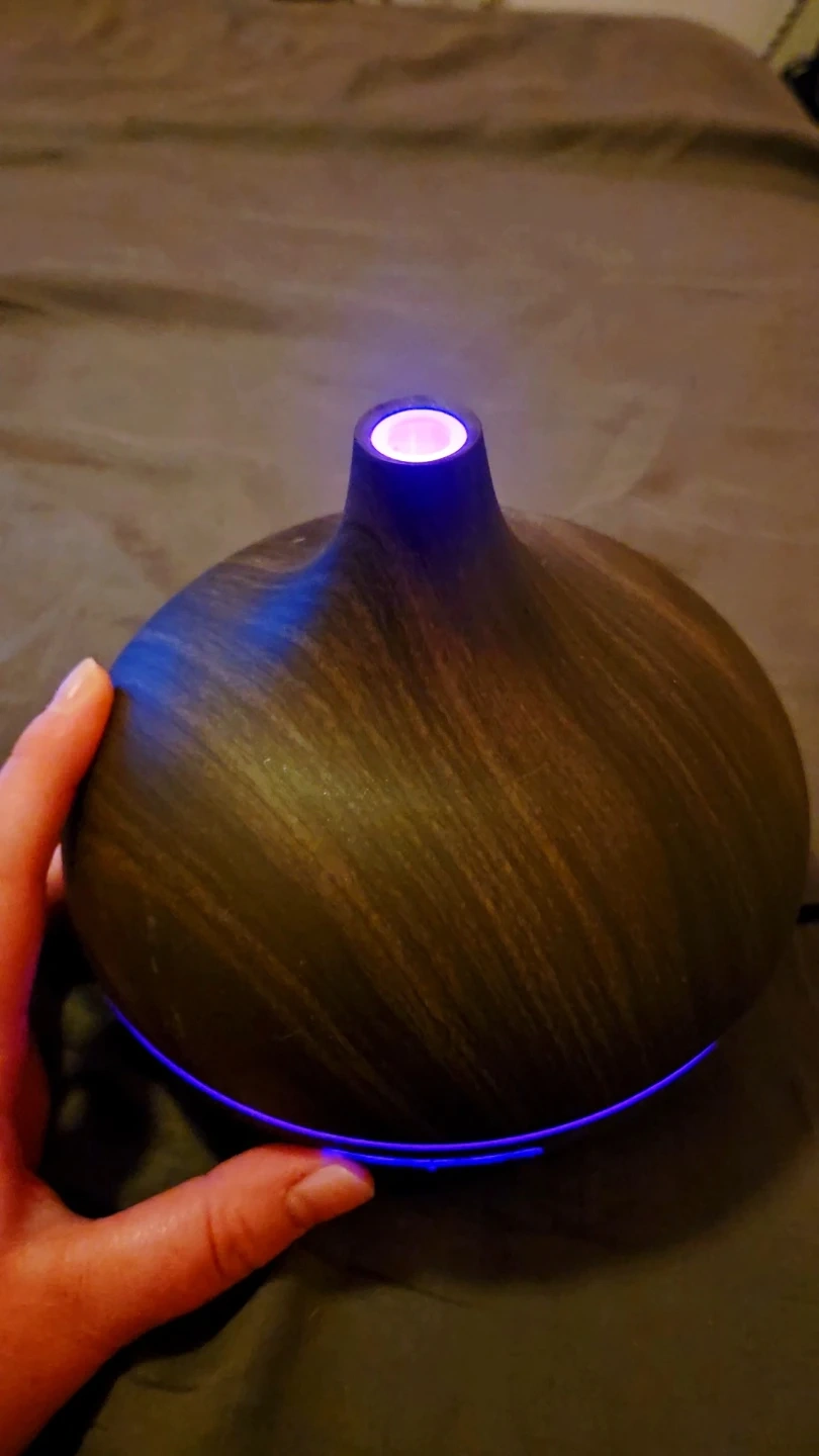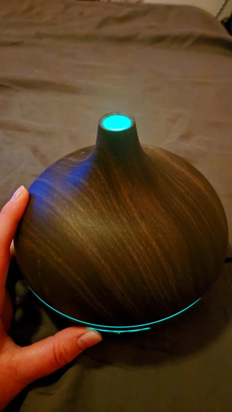 This aroma diffuser has a dark wood grain finish and multi-colour LED lighting. The light can be set rotate colours or stay one of 7+ solid options. It includes the power adapter. It's great for creating a relaxing atmosphere in any room!