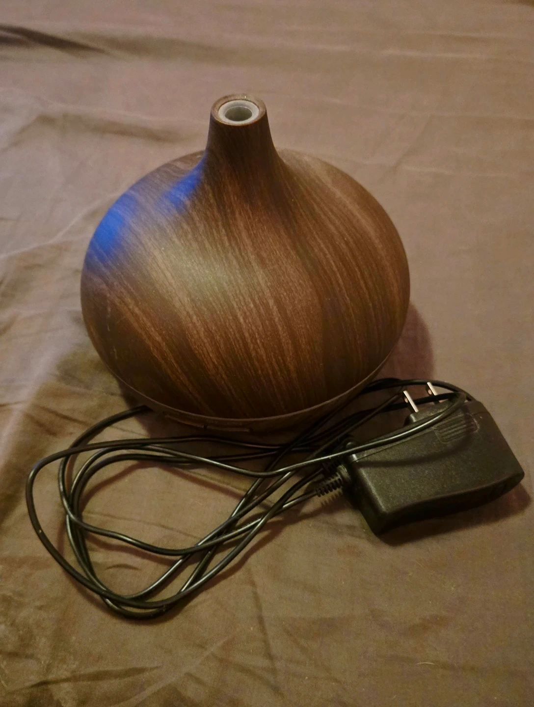 This aroma diffuser has a dark wood grain finish and multi-colour LED lighting. The light can be set rotate colours or stay one of 7+ solid options. It includes the power adapter. It's great for creating a relaxing atmosphere in any room!