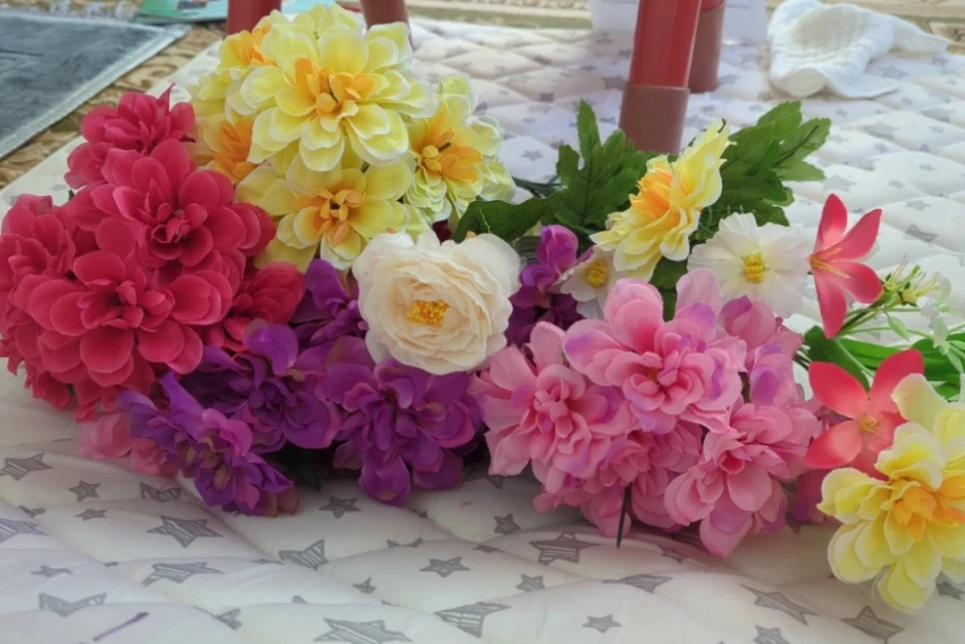 A lovely arrangement of artificial flowers in vibrant colours. Includes pink, purple, yellow, and white blooms. These flowers are great for adding a pop of colour to any room!