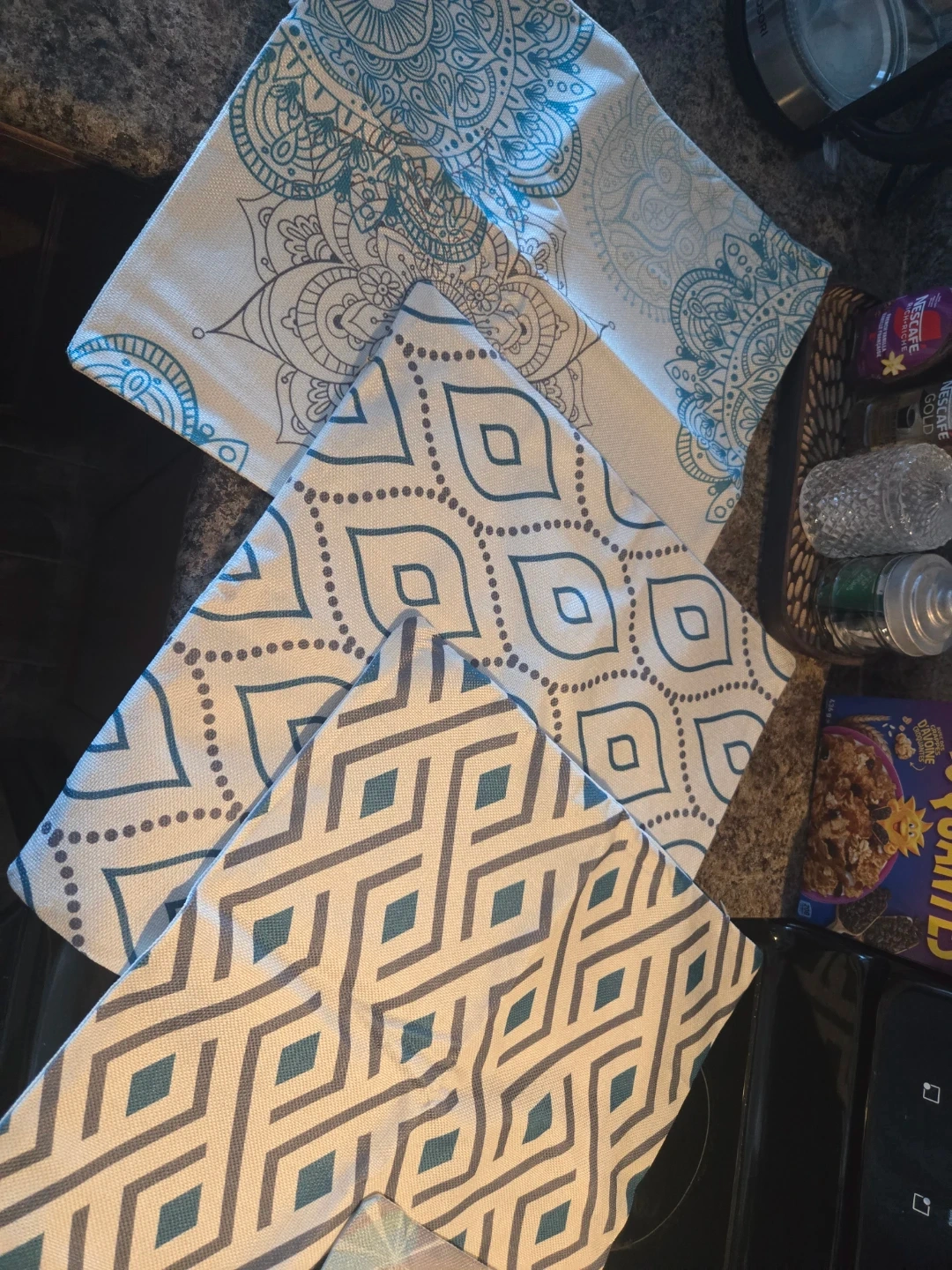 Four throw pillow covers featuring various decorative prints. These covers are made from a durable fabric, perfect for adding a touch of style to your living space. They're great for refreshing your home decor for a new season!