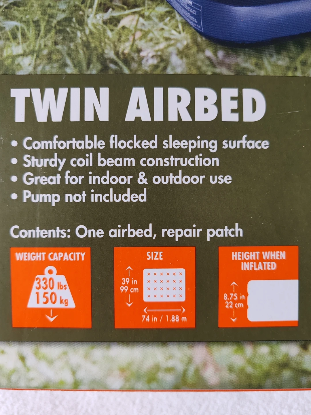 Comfortable flocked sleeping surface with sturdy coil beam construction. Great for indoor and outdoor use. The AC electric air pump is powered by a household outlet and includes 3 valve adaptors. Airbed size is 74 in. x 39 in. and inflates to 8.75 in. high.