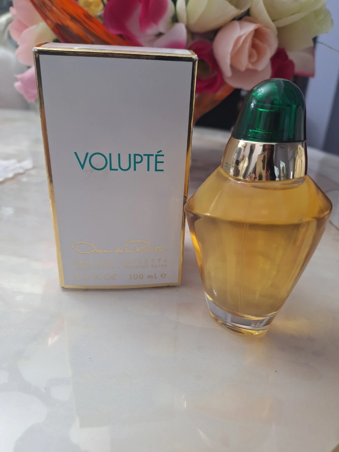 Oscar de la Renta Volupté Eau de Toilette. Vaporisateur Natural Spray. 100 mL bottle. Scent Profile: Floral, woody, powdery, with melon, citrus, and vanilla.