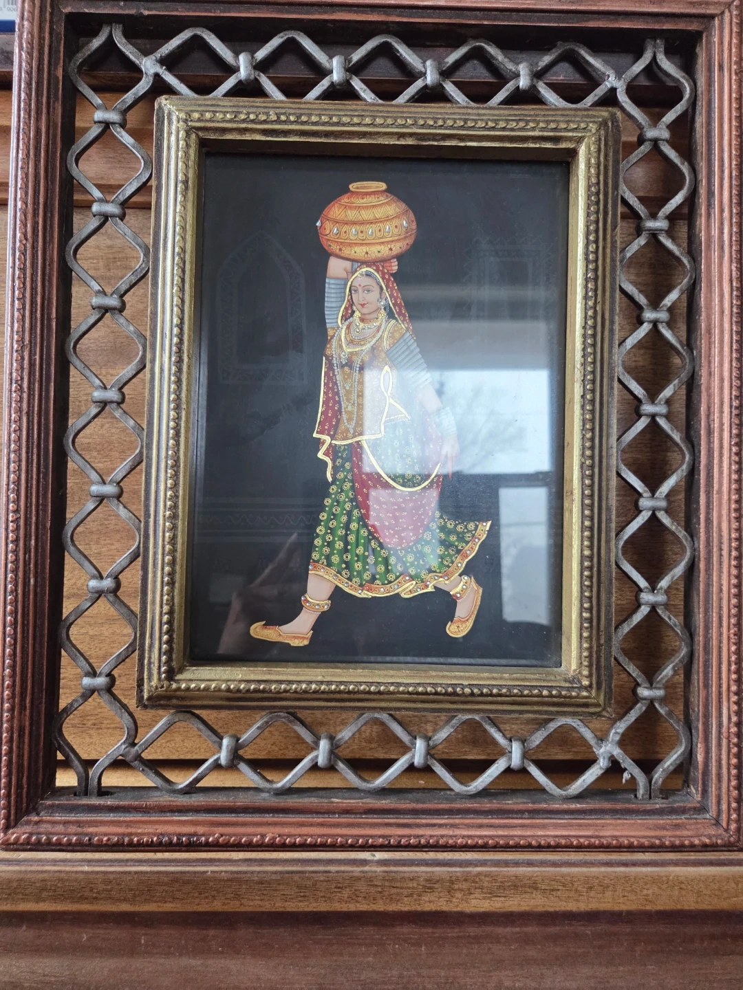 This framed artwork depicts an Indian woman carrying a pot on her head. The detailed painting is set within an ornate wooden and metal frame. It's a lovely piece for home decor.