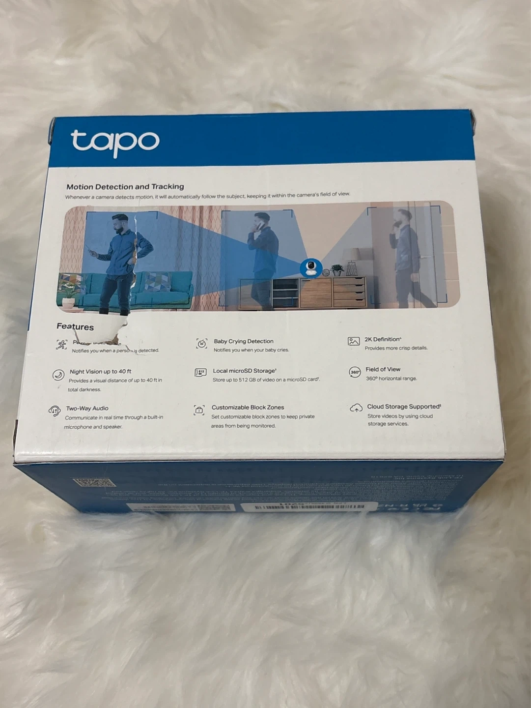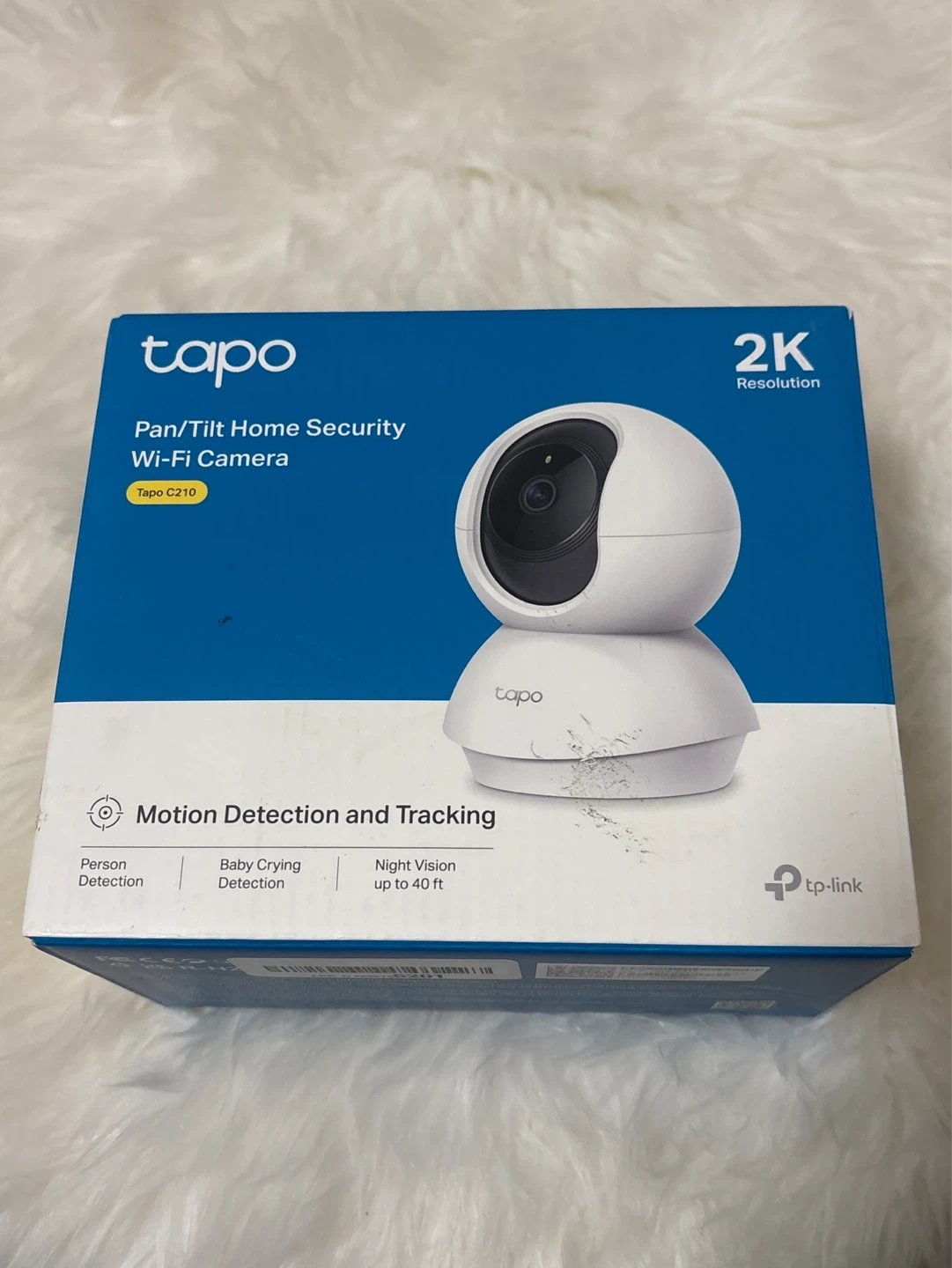 This Tapo Wi-Fi camera offers motion detection and tracking. It features 2K resolution and night vision up to 40 ft. Includes a power adapter and is ready for home security use.