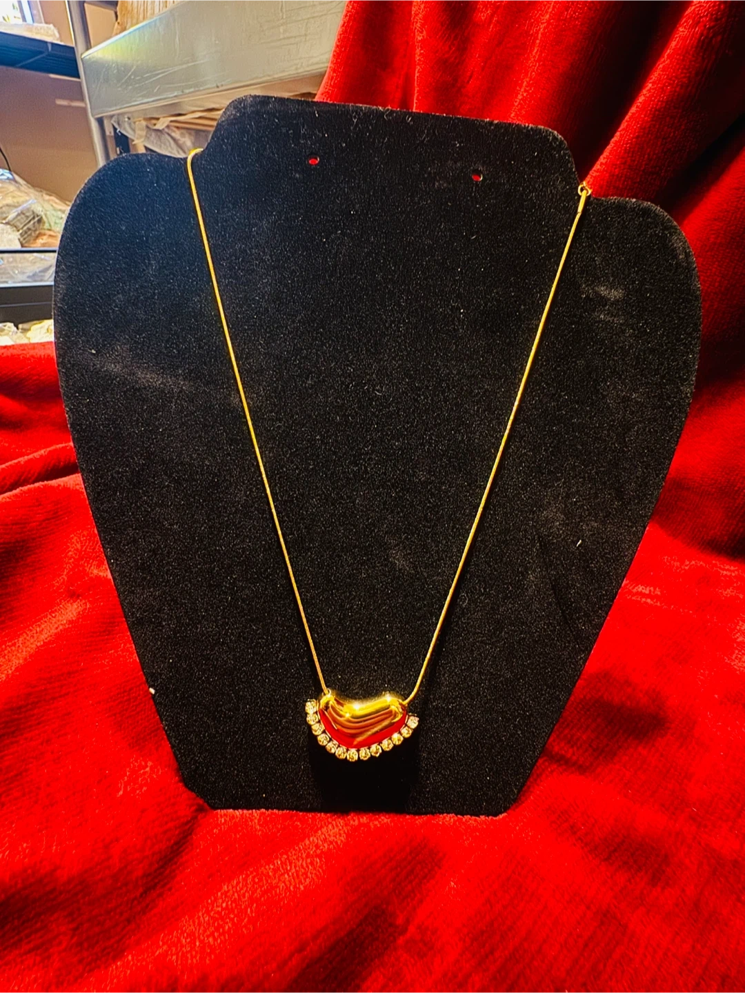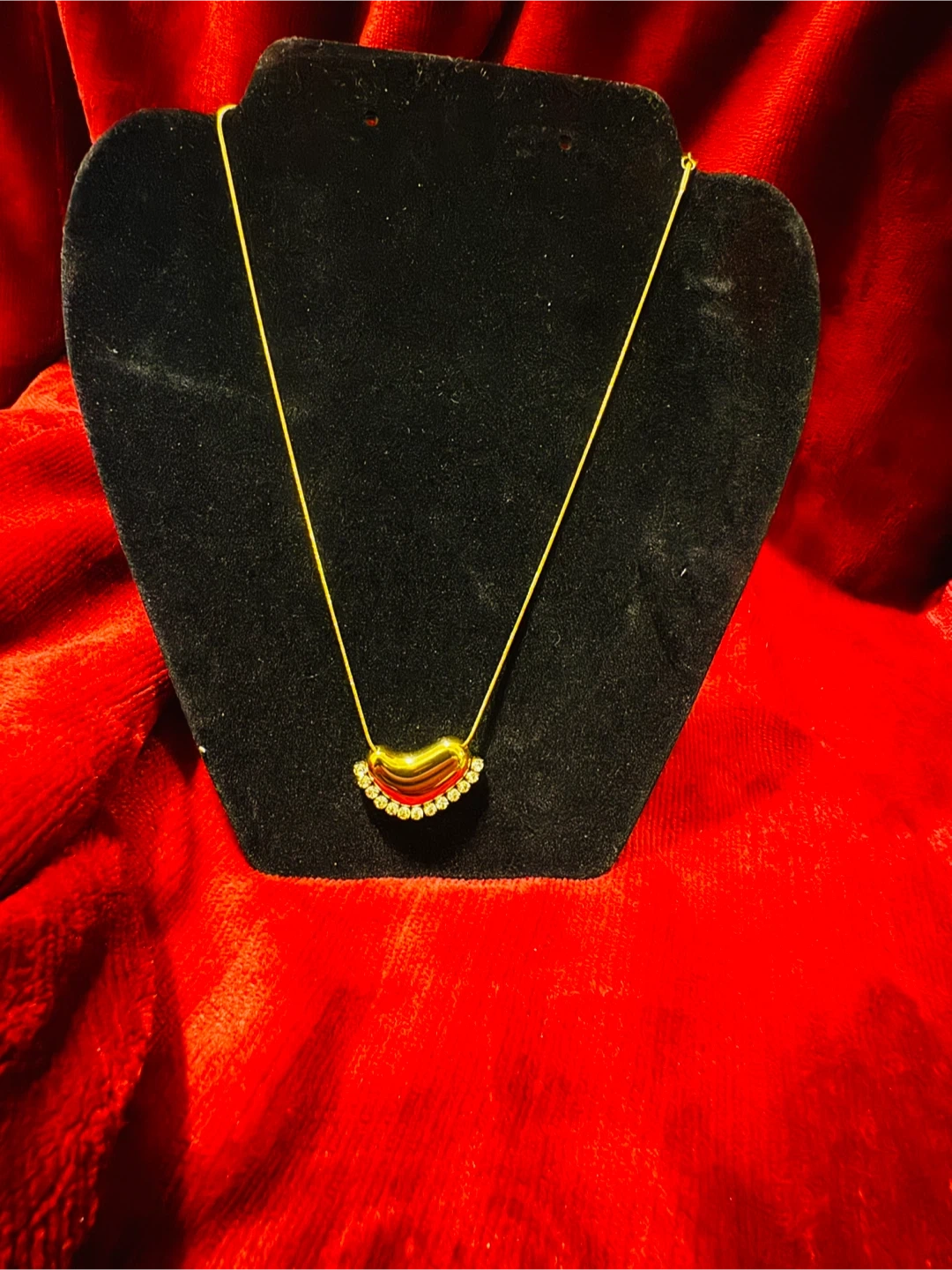 This necklace features a gold-tone chain with a unique curved pendant. The pendant has a glossy red centre surrounded by clear crystals. It's a lovely piece for adding a pop of colour. This is stainless steel antitarnish jewellery.