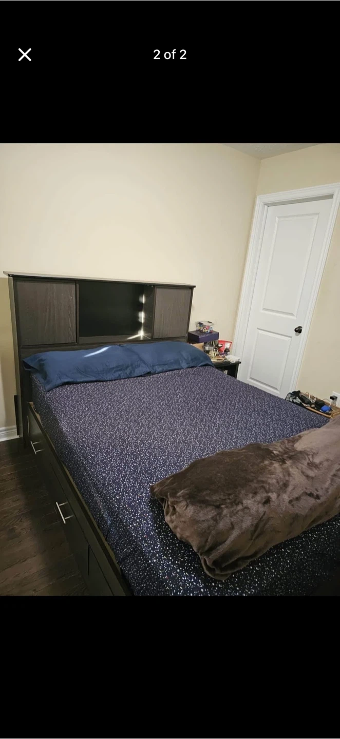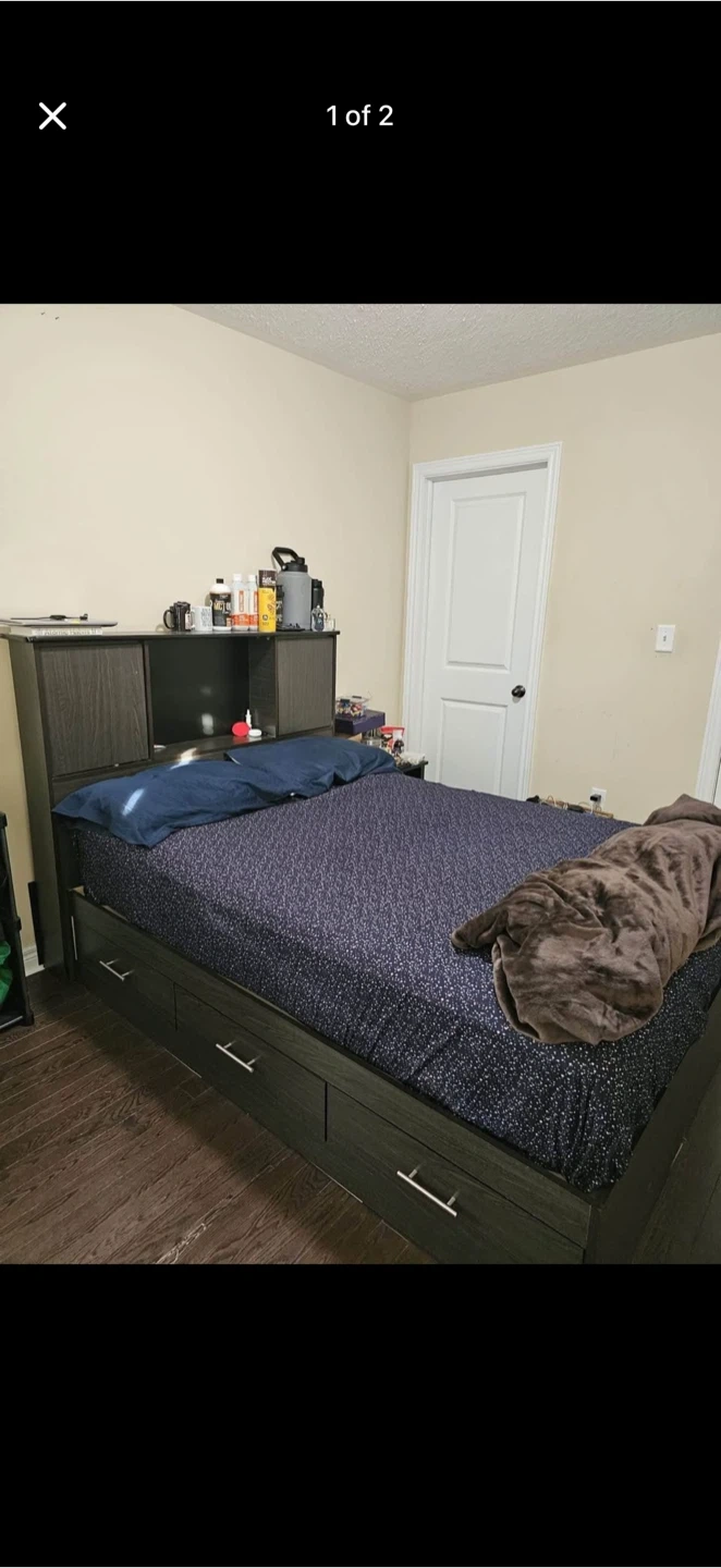 Double bed frame in a dark wood finish. Features a headboard with built-in shelves and six storage drawers underneath. Ample storage for your bedroom essentials! It has a trunk storage on one side and 3 drawers on the other side.