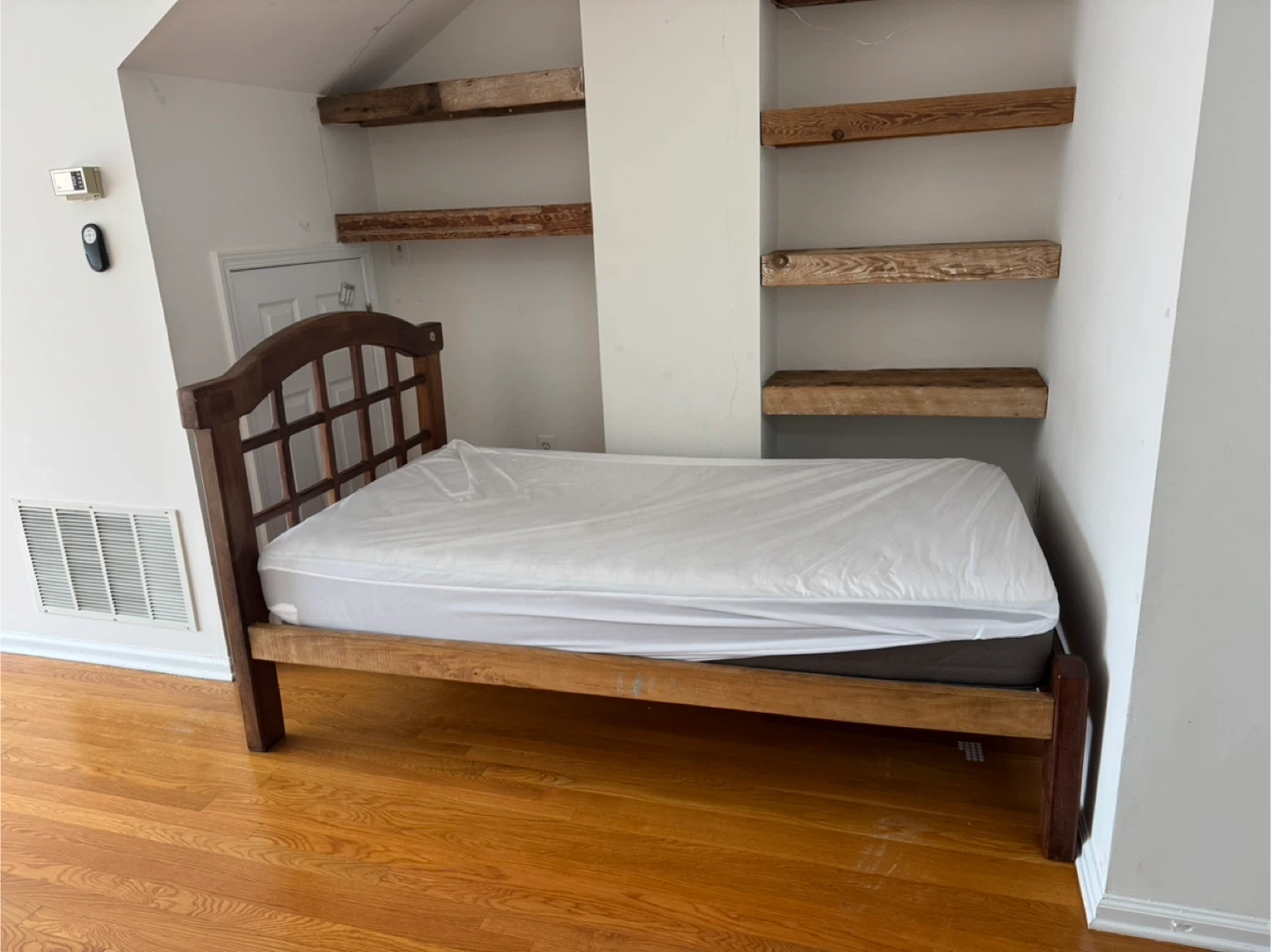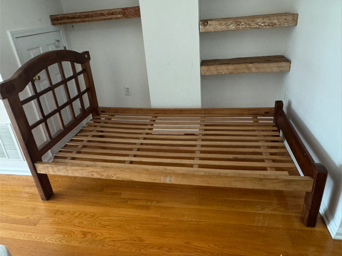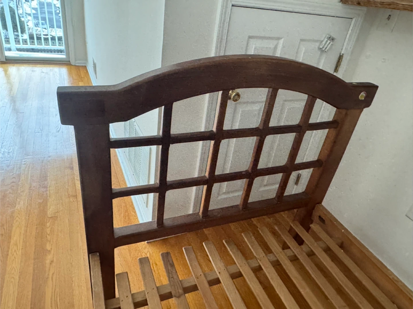 A solid wooden bed frame with a dark wood finish. It features a distinctive arched headboard with a grid pattern. Includes wooden slats for mattress support. Bed frame is made of wood.