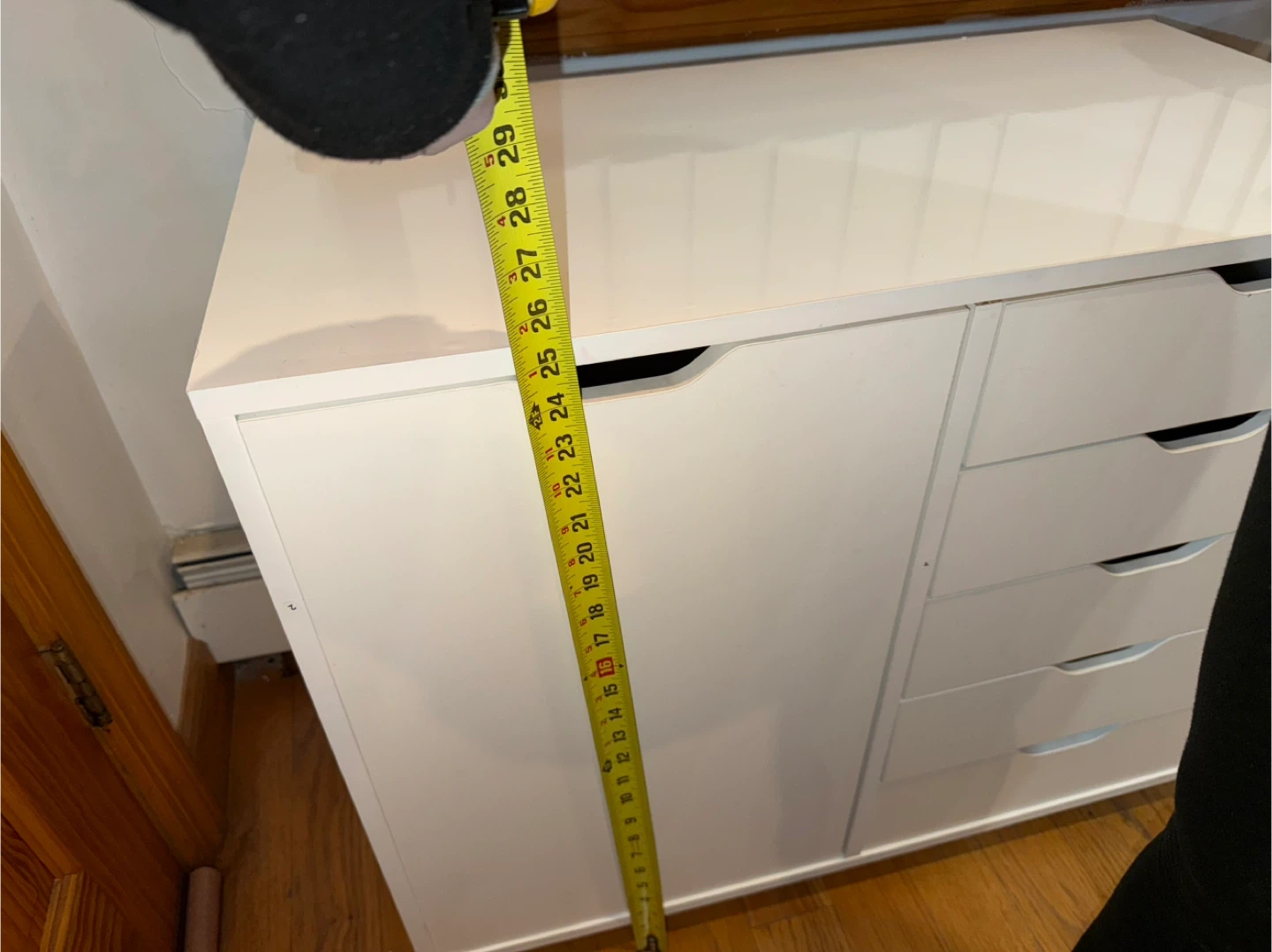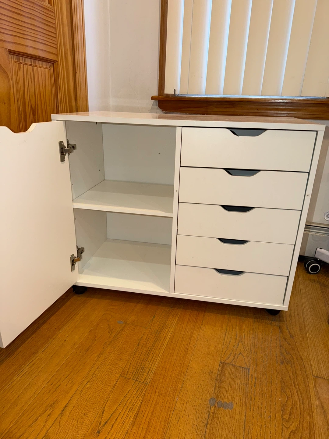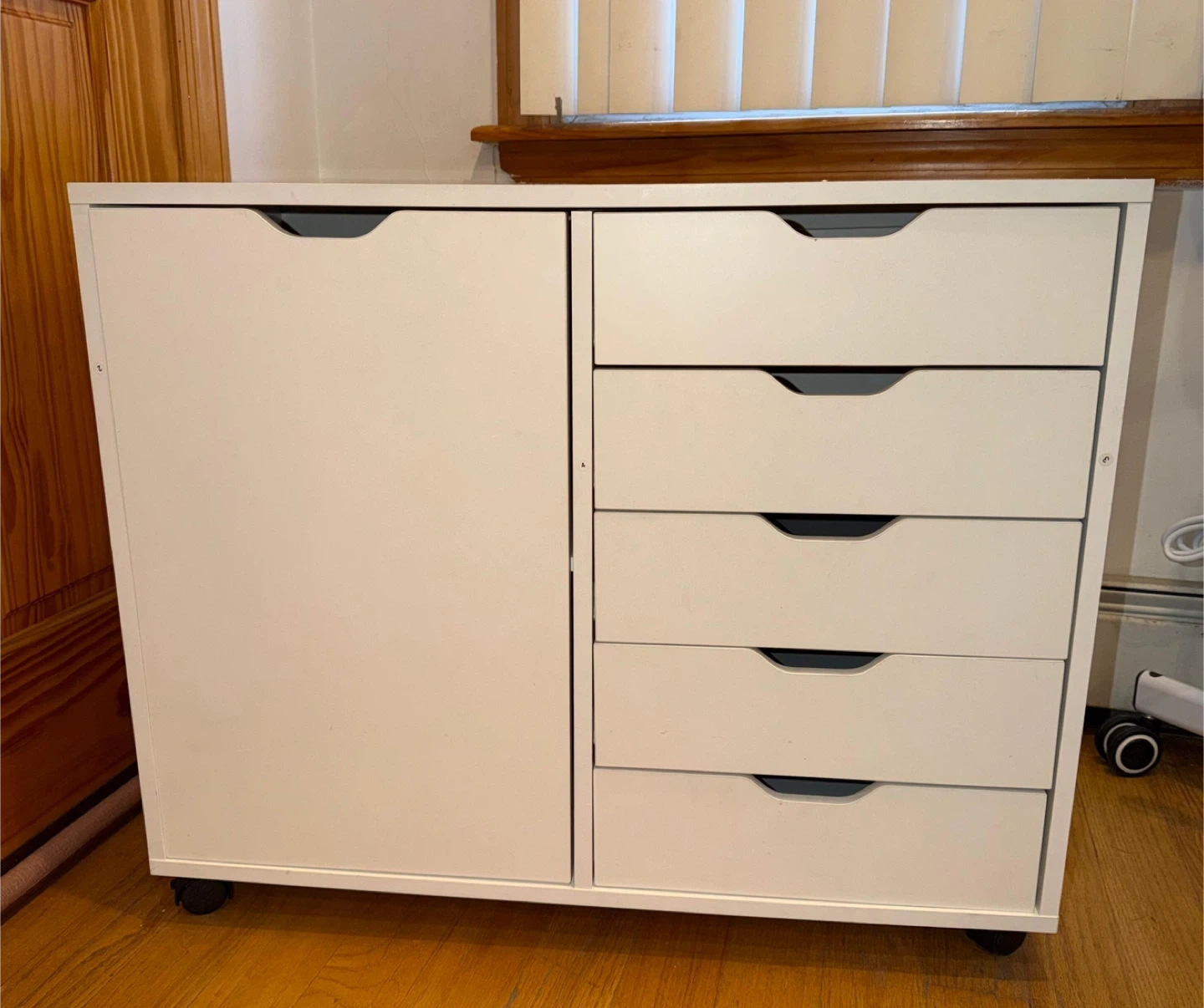 This white storage cabinet features one side with a door opening to shelves and the other with five drawers. Its compact size makes it great for organizing craft supplies or small items. Measurements: approximately 30 inches wide, 17 inches deep, and 28 inches high.