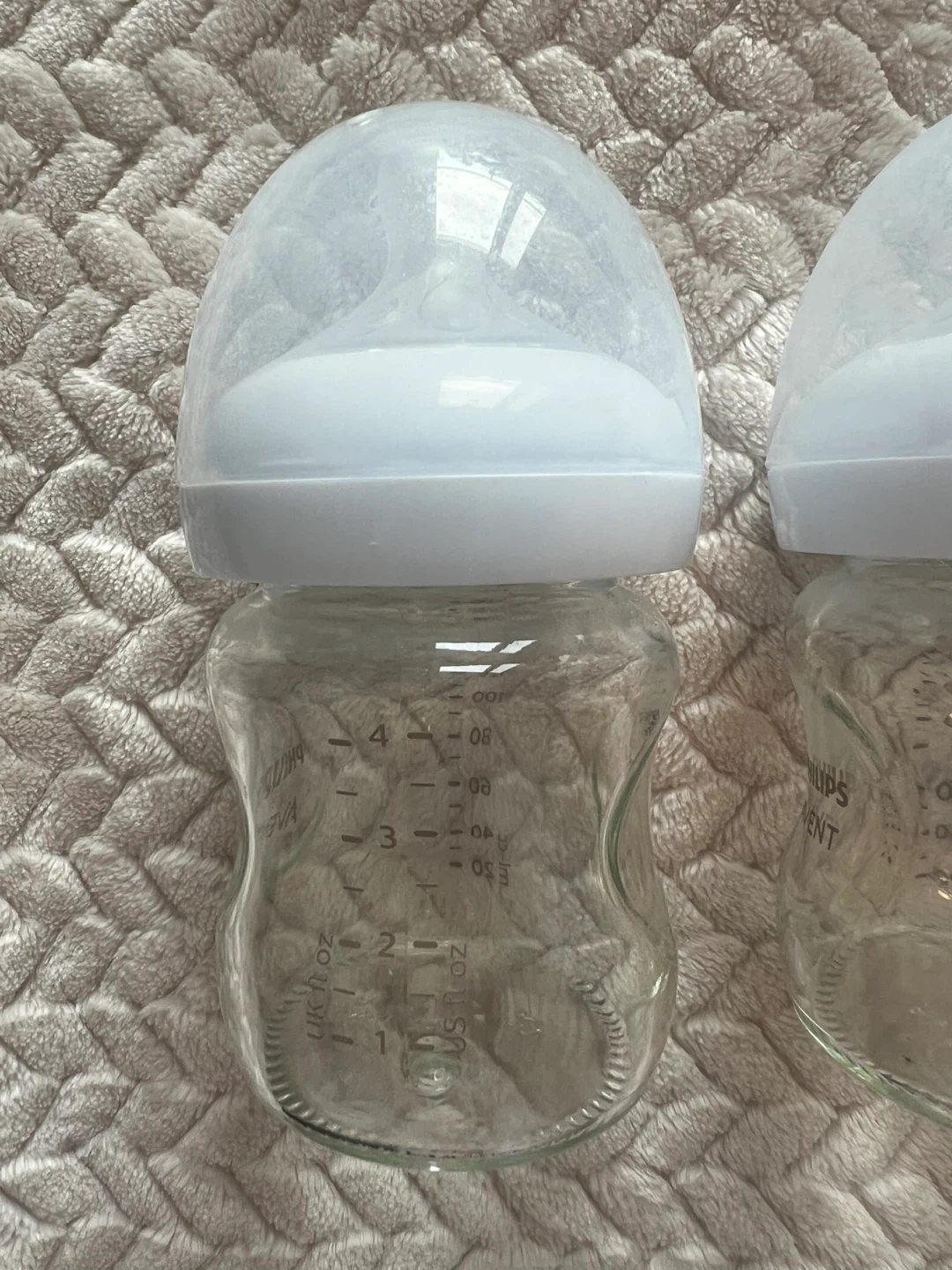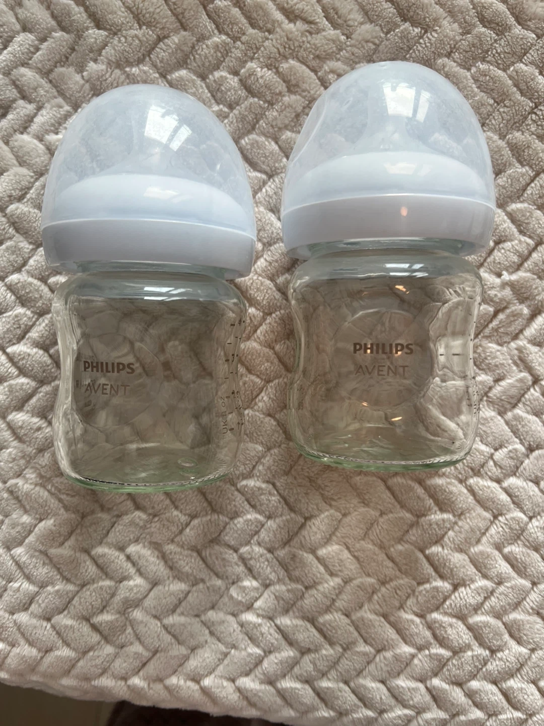 Two Philips Avent glass baby bottles, 4 ounces