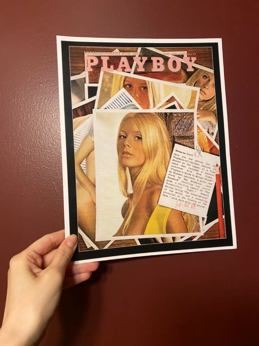 A framed art print featuring a collage of images from a Playboy magazine cover. The print showcases vintage photography and text. This unique piece would be a conversation starter for any collector.