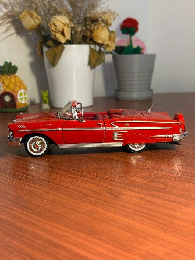 Highly detailed 1:24 scale die-cast model of the classic 1958 Chevrolet Impala Convertible by Motor Max. Authentic licensed product, perfect for car enthusiasts and collectors. Features: Scale: 1:24. Color: Red exterior with a detailed red interior. Material: Die-cast metal body with some plastic parts. Details: Authentically crafted with intricate details. Features a detailed interior. Opening front doors and a functional boot/trunk. Rubber tires. True-to-scale design. Condition: Used - Like new. Cash accepted.