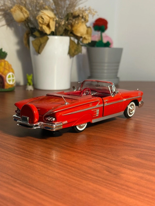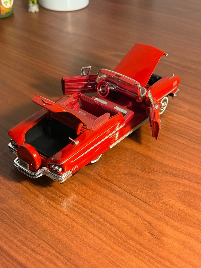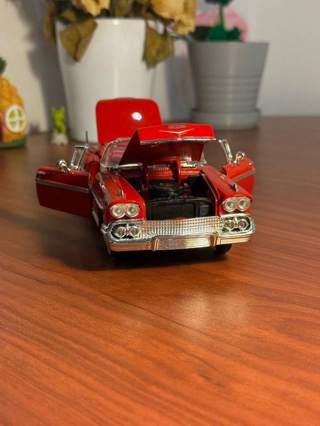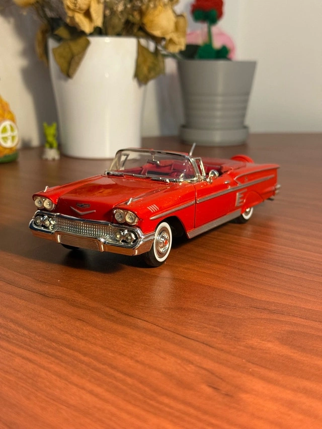 Highly detailed 1:24 scale die-cast model of the classic 1958 Chevrolet Impala Convertible by Motor Max. Authentic licensed product, perfect for car enthusiasts and collectors. Features: Scale: 1:24. Color: Red exterior with a detailed red interior. Material: Die-cast metal body with some plastic parts. Details: Authentically crafted with intricate details. Features a detailed interior. Opening front doors and a functional boot/trunk. Rubber tires. True-to-scale design. Condition: Used - Like new. Cash accepted.