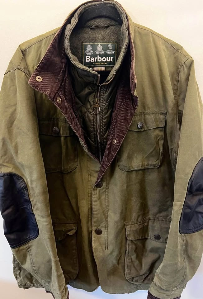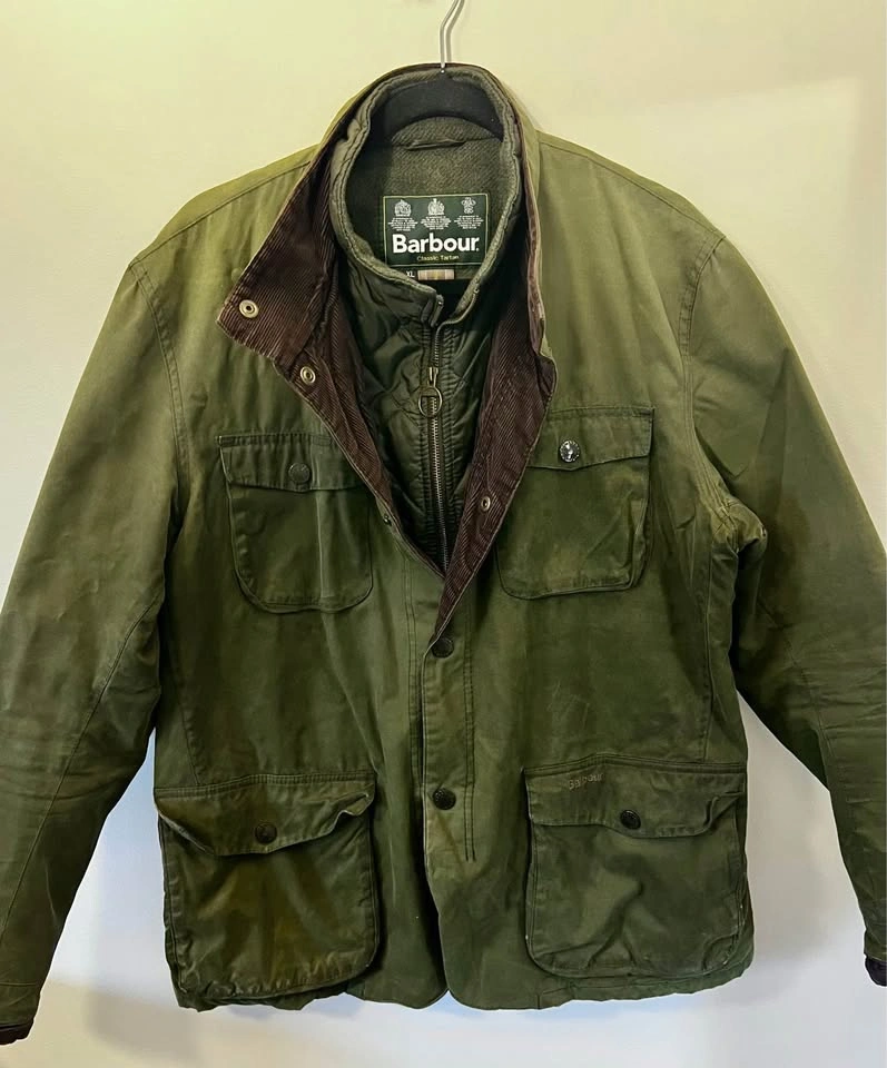Selling a used Barbour Ogston Wax Cotton Jacket in olive, size XL. This durable jacket features a waxed cotton exterior, corduroy collar, and multiple pockets. It's perfect for outdoor activities or everyday wear. The jacket is in good condition, showing some signs of wear. I will include a can of Barbour wax to rewax if desired. Original price of $800 and bought in Oxford, I’ve priced this one to sell quickly. I can also include a can of Barbour wax to rewax the jacket if desired. Let me know if you're interested!