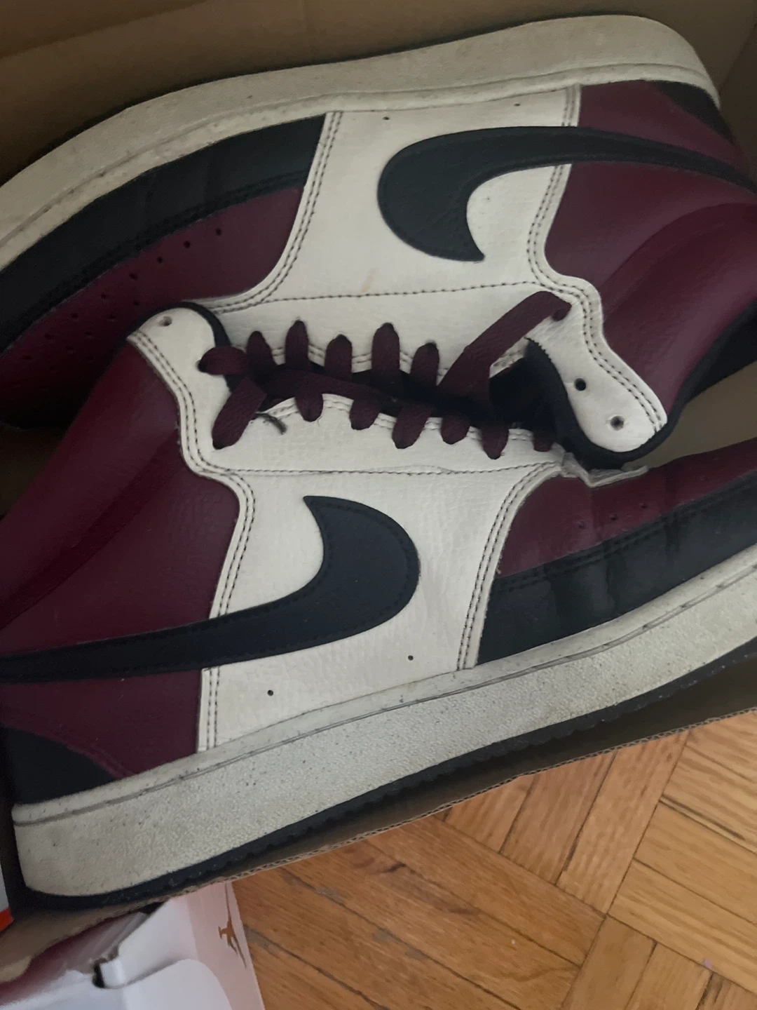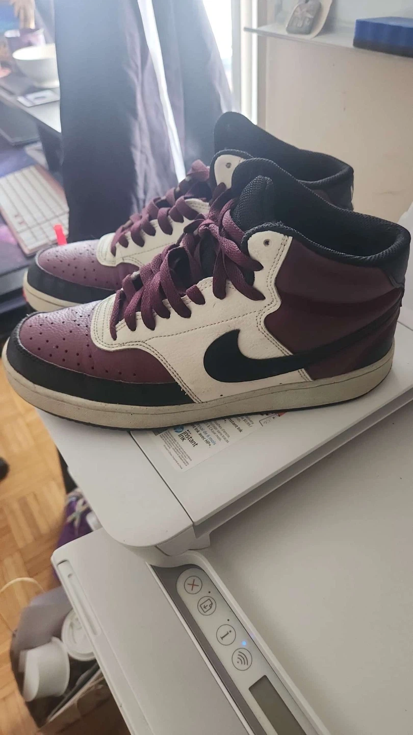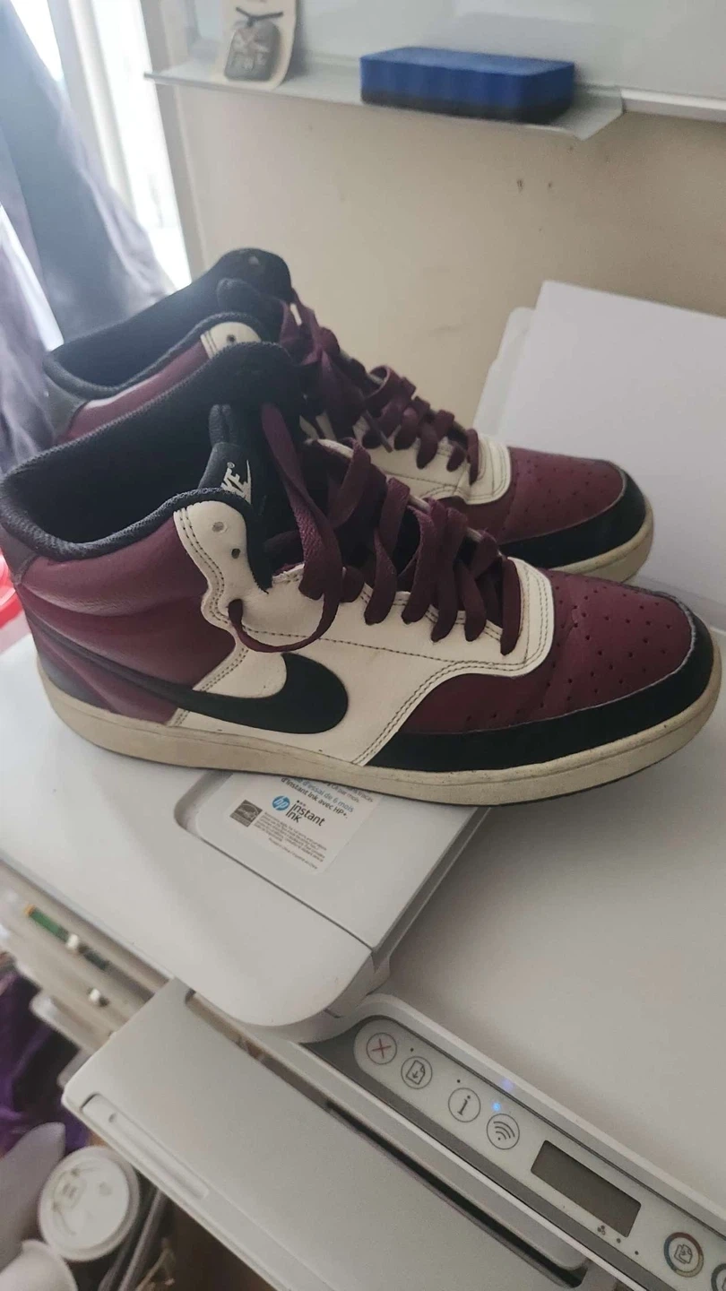 Classic Nike sneakers in a burgundy, white, and black colourway. These high-top shoes are a statement piece for any sneaker collection. They feature a leather and synthetic upper with a rubber sole for durability PRICE IS NEGOTIABLE AVAILABLE FOR HOME PICK UP No box need them gone asap