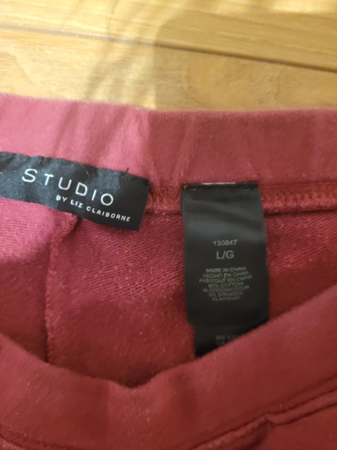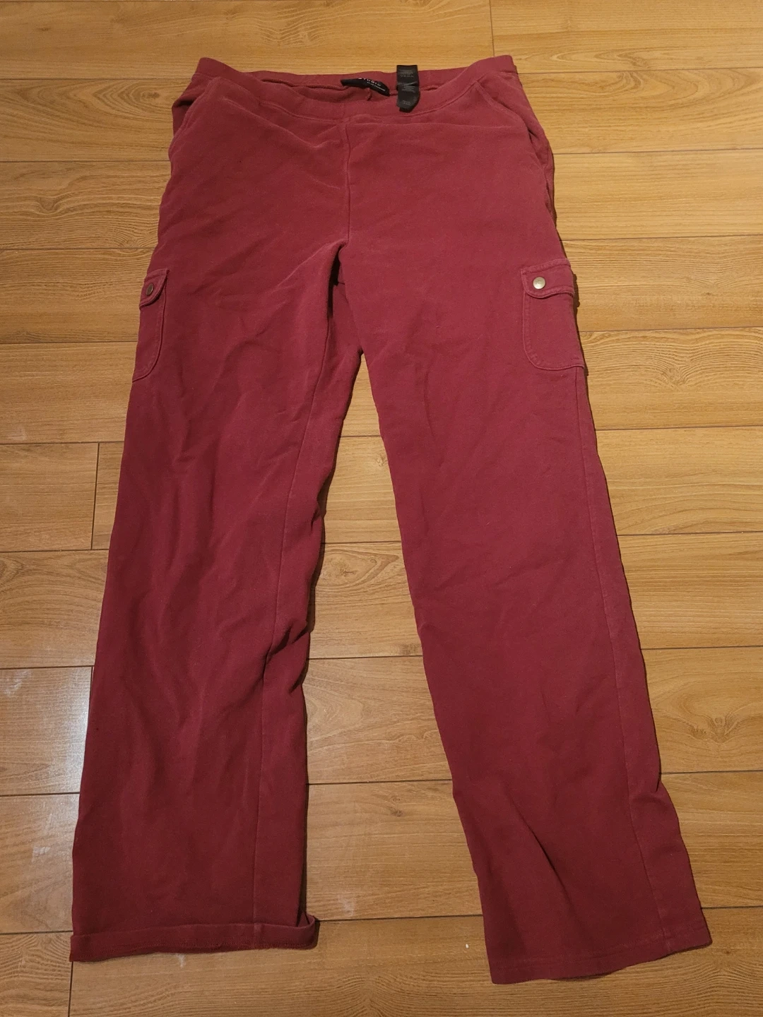 These Studio by Liz Claiborne cargo pants come in a deep red colour. They are a size large and made with a blend of 95% cotton and 5% spandex for comfort. Features two cargo pockets on the sides. These would be great for casual everyday wear!