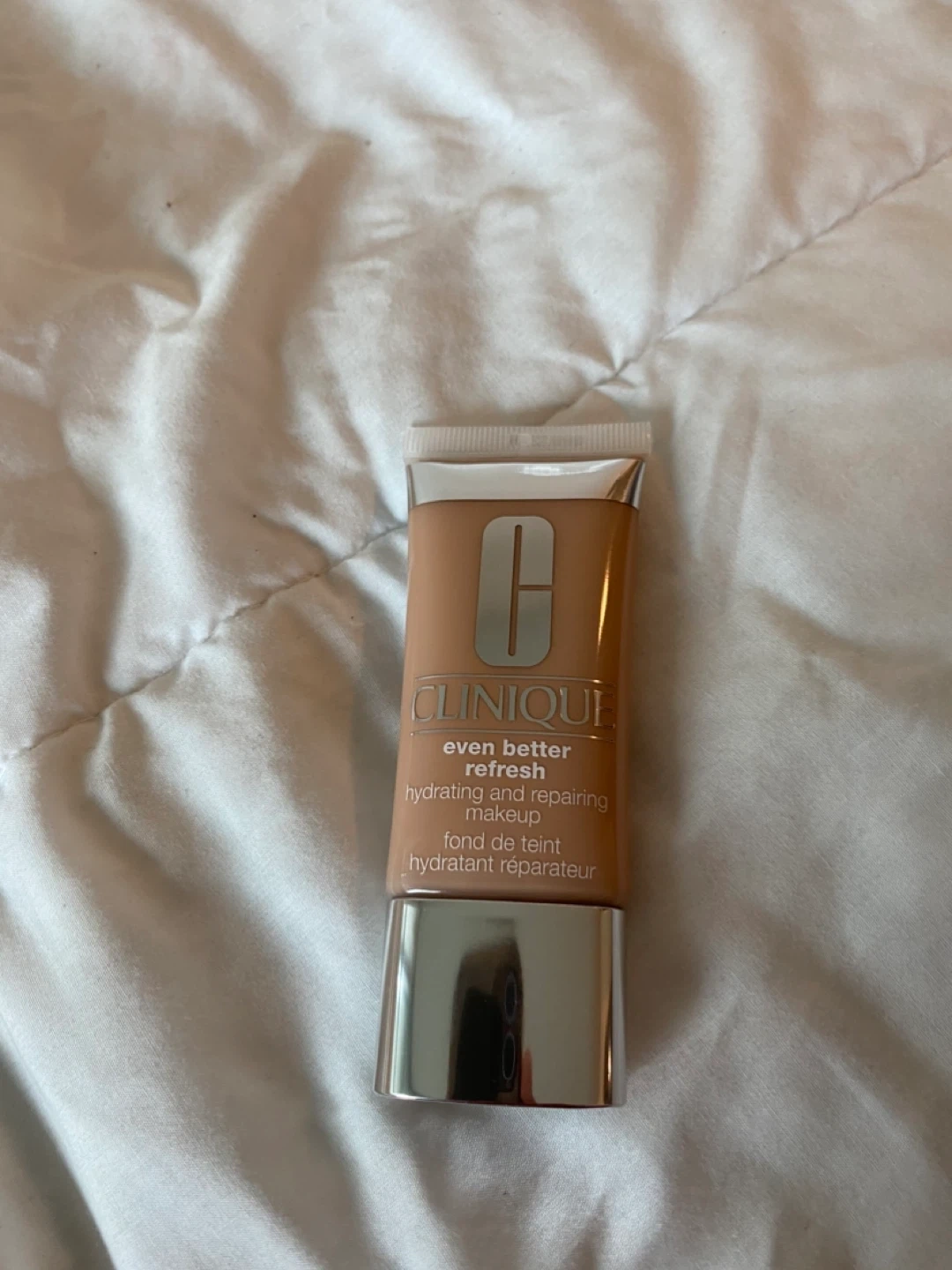 Clinique Even Better Refresh hydrating and repairing makeup foundation. This foundation is designed to hydrate and repair the skin. It comes in a convenient tube with a silver cap.