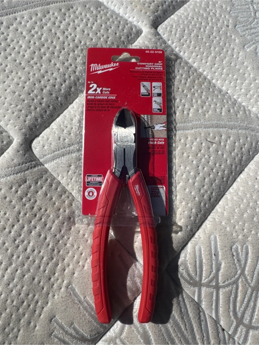 Milwaukee Comfort Grip Diagonal Cutting Pliers, 6 inches. Features an Iron-Carbide Edge for up to 2x more cuts. Tapered nose for flush cuts. Includes reamer and wire stripper.