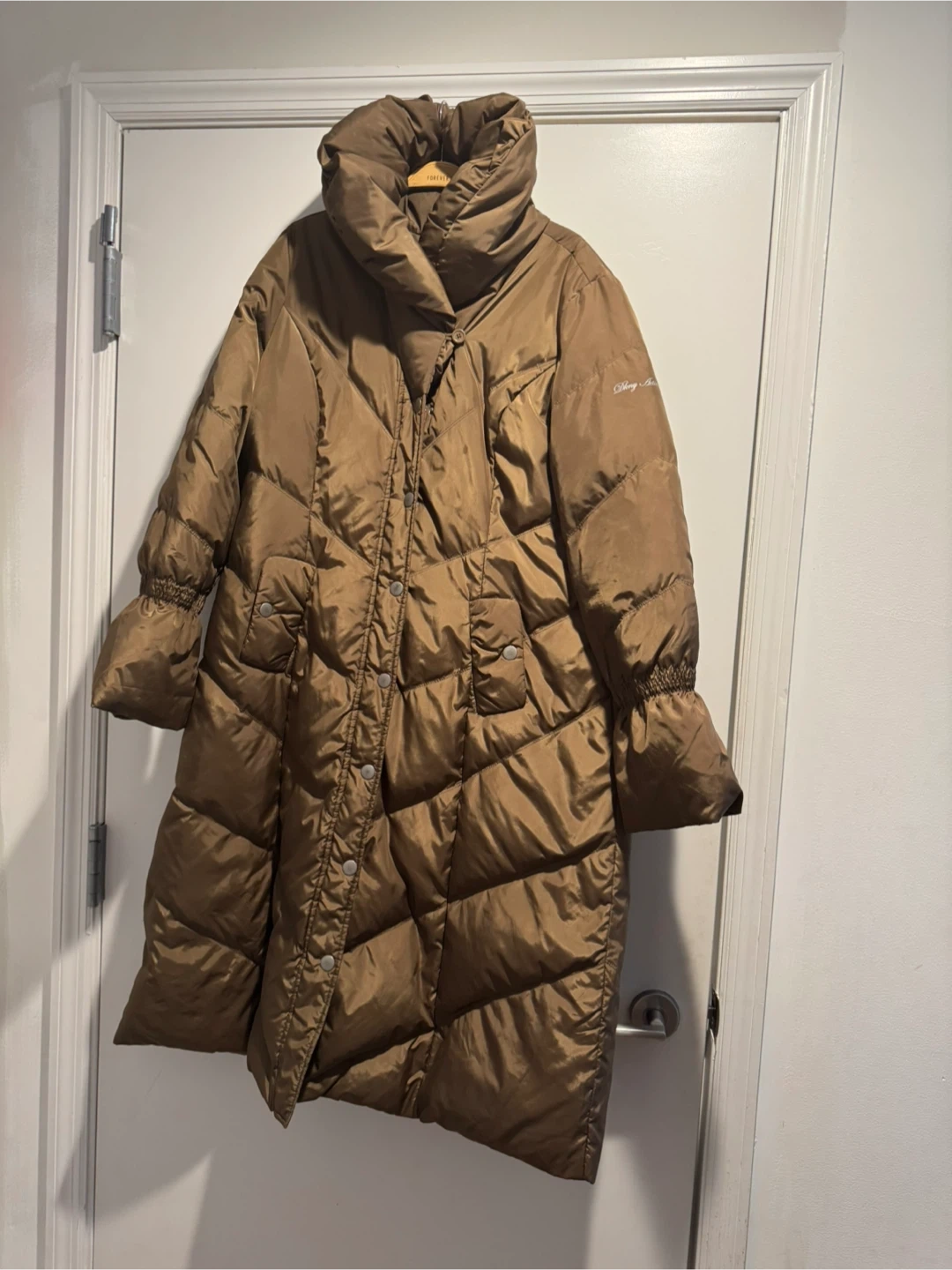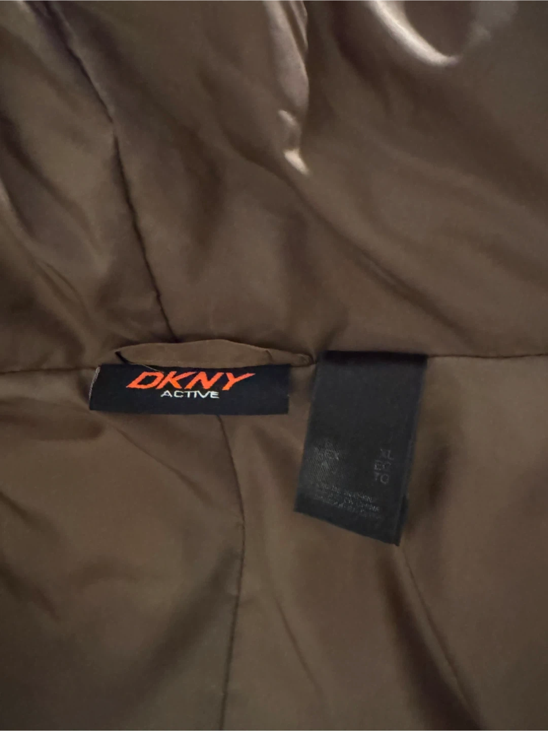 Selling a DKNY Active puffer zipper coat in taupe 2 side pockets ! It's a size XL and has a long 3 snaps in the back at the bottom of coat , warm design perfect for colder weather with the cow neck collar!
