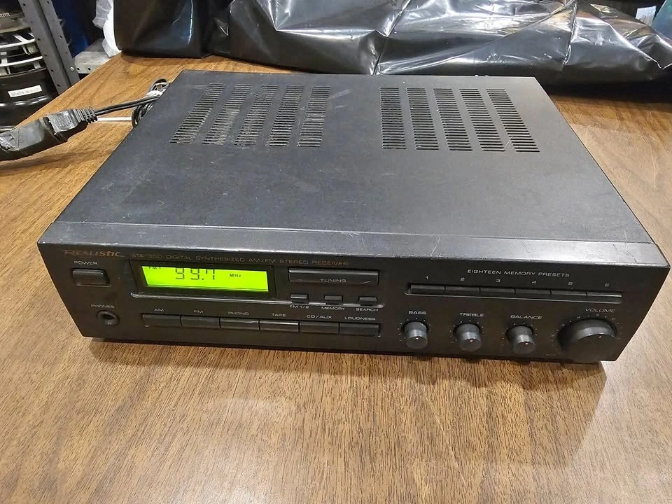 Realistic STA-300 stereo receiver with built-in AM/FM tuner. Includes phono input for turntables, plus CD/AUX and tape inputs. Simple and reliable setup for vintage audio systems. All controls working, display lights up. Good condition.