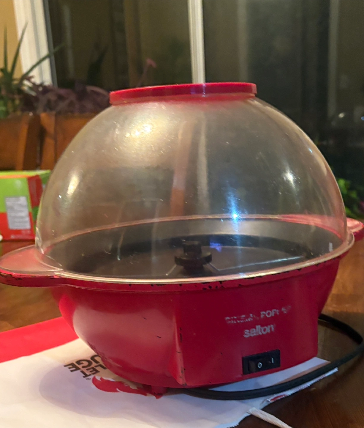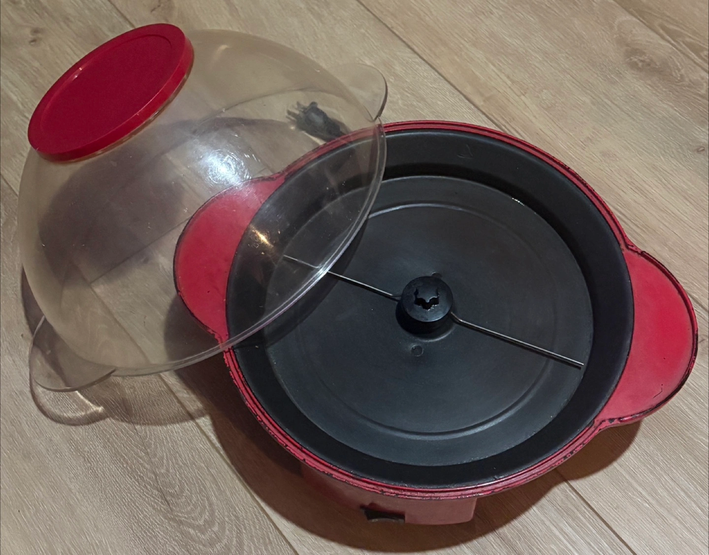 A popcorn maker in good working condition. The unit includes a clear plastic lid, a red base with handles, and a power cord. Perfect for a cosy movie night at home.
