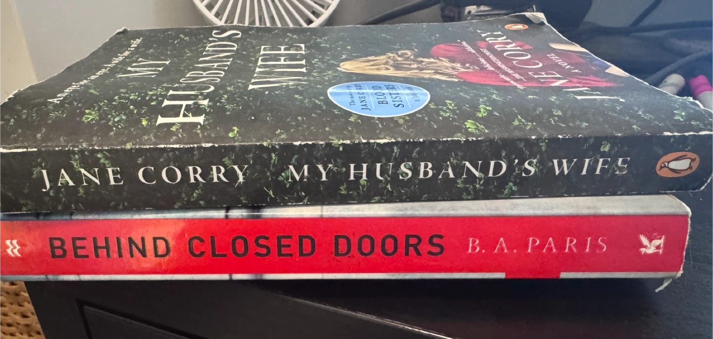 Two paperback novels. 'My Husband's Wife' by Jane Corry and 'Behind Closed Doors' by B.A. Paris. Perfect for fans of thrilling suspense stories!