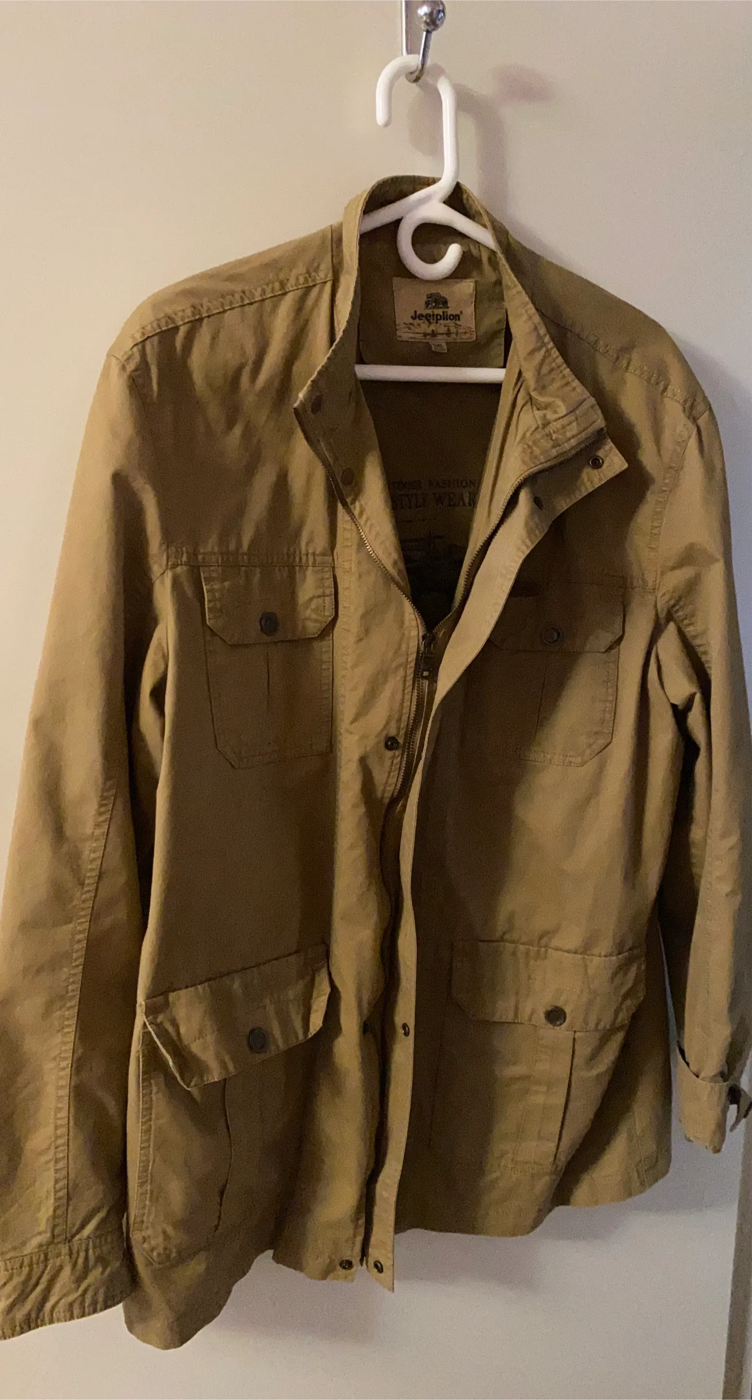 Selling a JeepJlion' jacket in size XL! It's a light beige colour and has a stylish, rugged look. Perfect for layering or wearing on its own during the warmer months. It features multiple pockets for convenience.