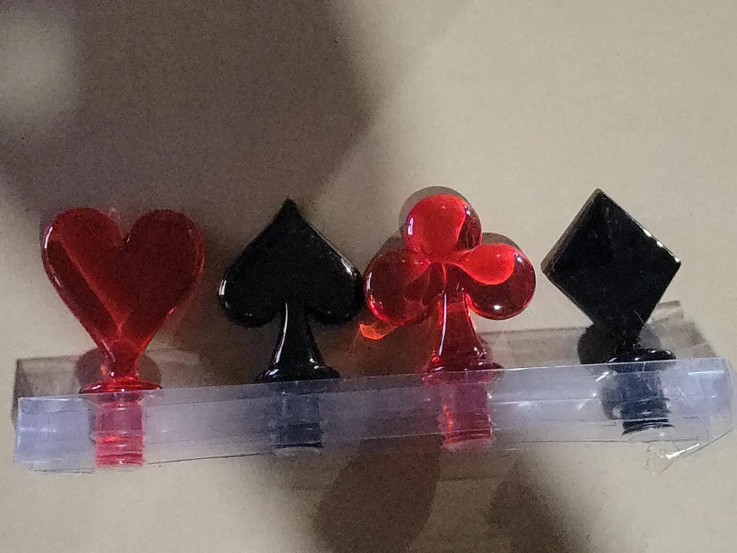 This set includes four bottle stoppers shaped like poker card suits: hearts, spades, clubs, and diamonds. They're made of acrylic and plastic. Great for wine bottles or other beverages! Never been used in original packaging