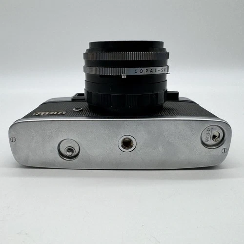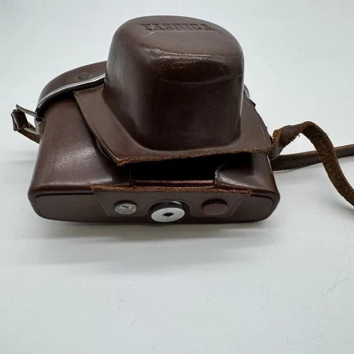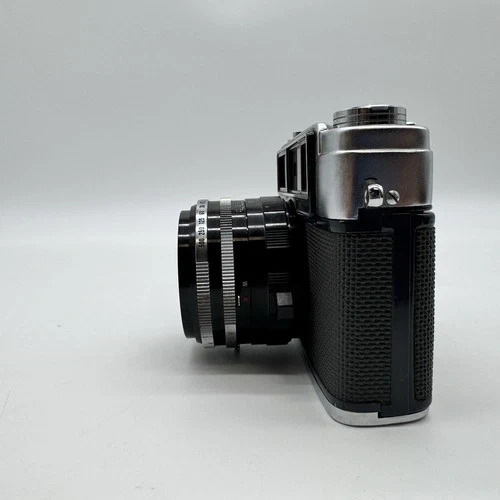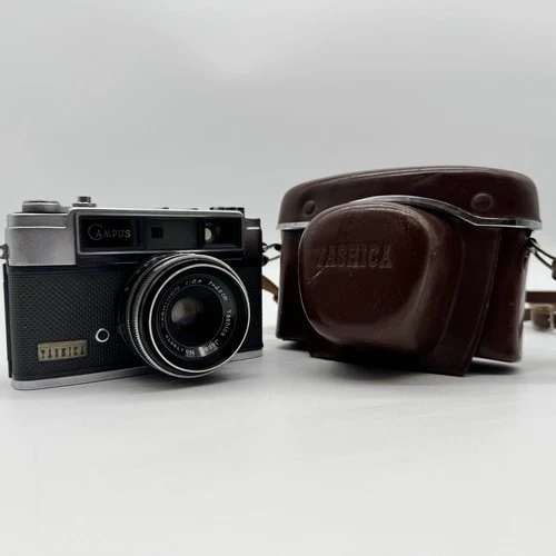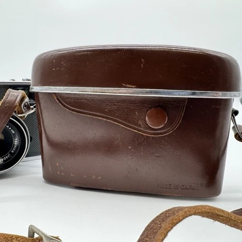 Vintage Yashica Campus 35mm rangefinder film camera, manufactured in Japan during the mid-1960s. This camera features the well-regarded Yashinon 45mm f/2.8 lens and a Copal-SV leaf shutter, known for reliability and smooth operation. Includes the original brown leather Yashica case and strap, adding both collector and display value.