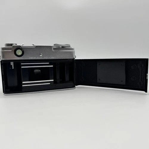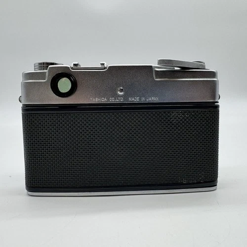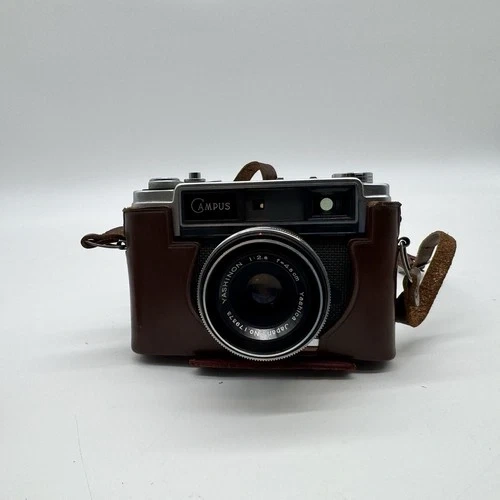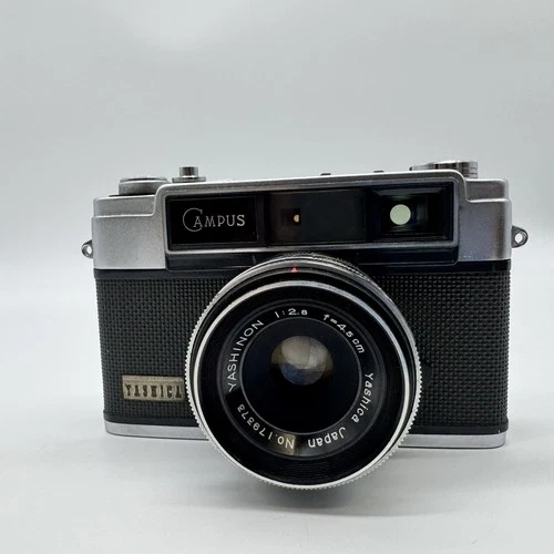 Vintage Yashica Campus 35mm rangefinder film camera, manufactured in Japan during the mid-1960s. This camera features the well-regarded Yashinon 45mm f/2.8 lens and a Copal-SV leaf shutter, known for reliability and smooth operation. Includes the original brown leather Yashica case and strap, adding both collector and display value.