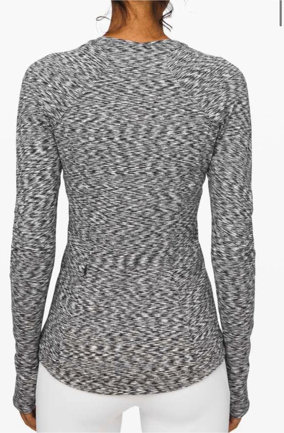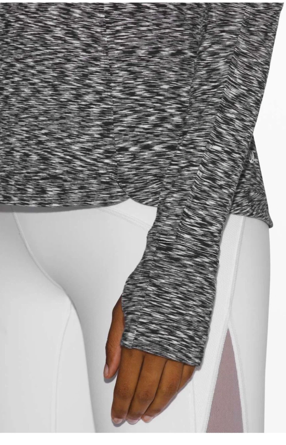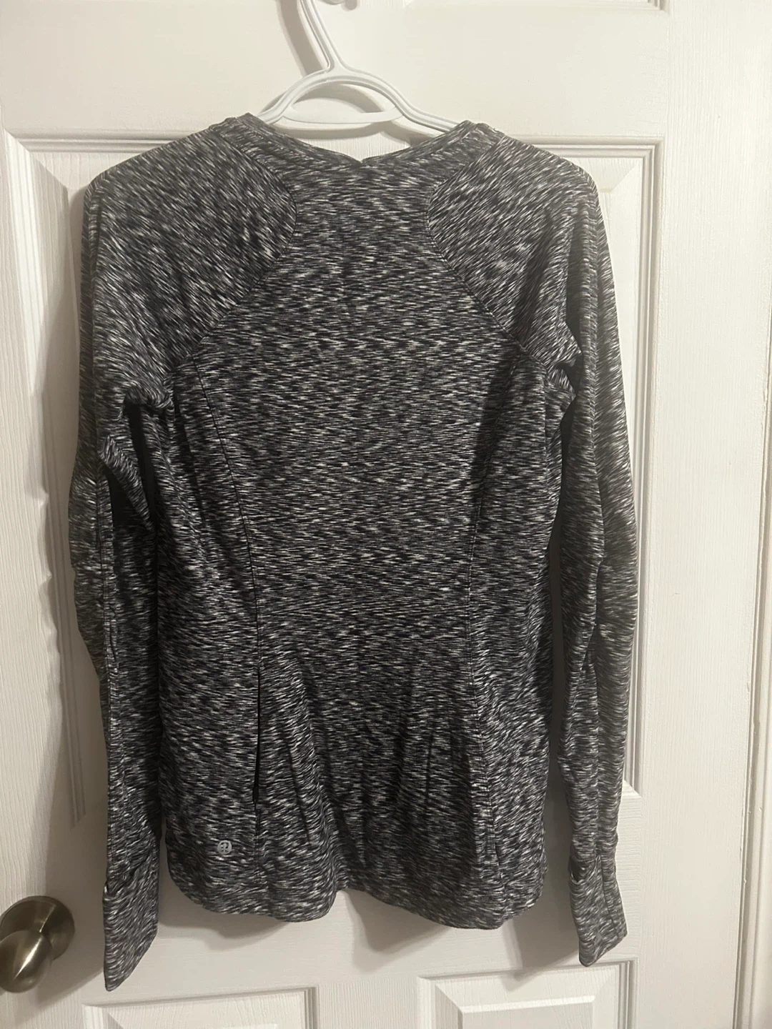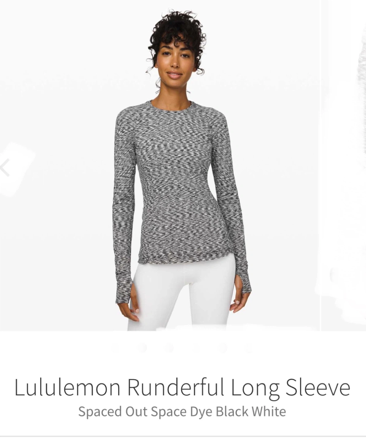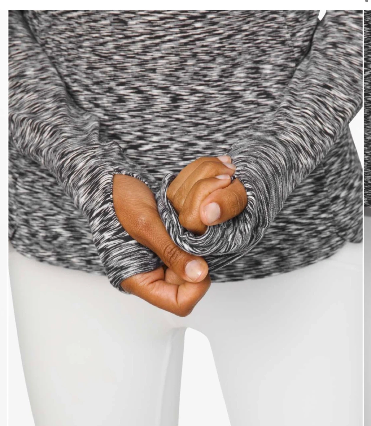 This is a Lululemon Runderful Long Sleeve shirt in a size 10. It's a black and white space dye pattern. Material is breathable and lightweight, perfect for running or workouts. Thumbholes at the cuffs for extra coverage.
