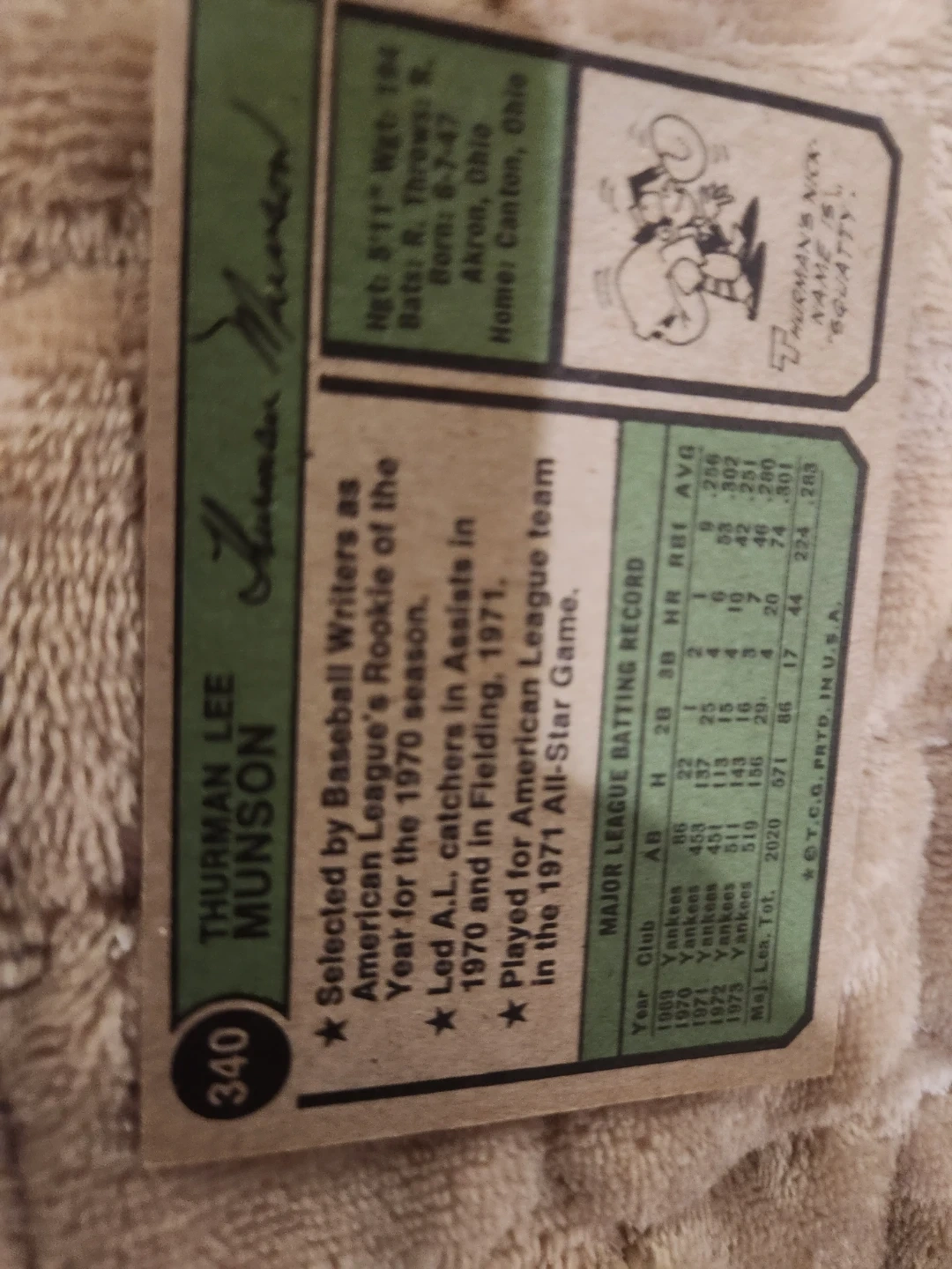 This is a 1977 Topps baseball card featuring Thurman Munson. It shows his career stats and details his accomplishments as catcher for the New York Yankees. Card number 340.