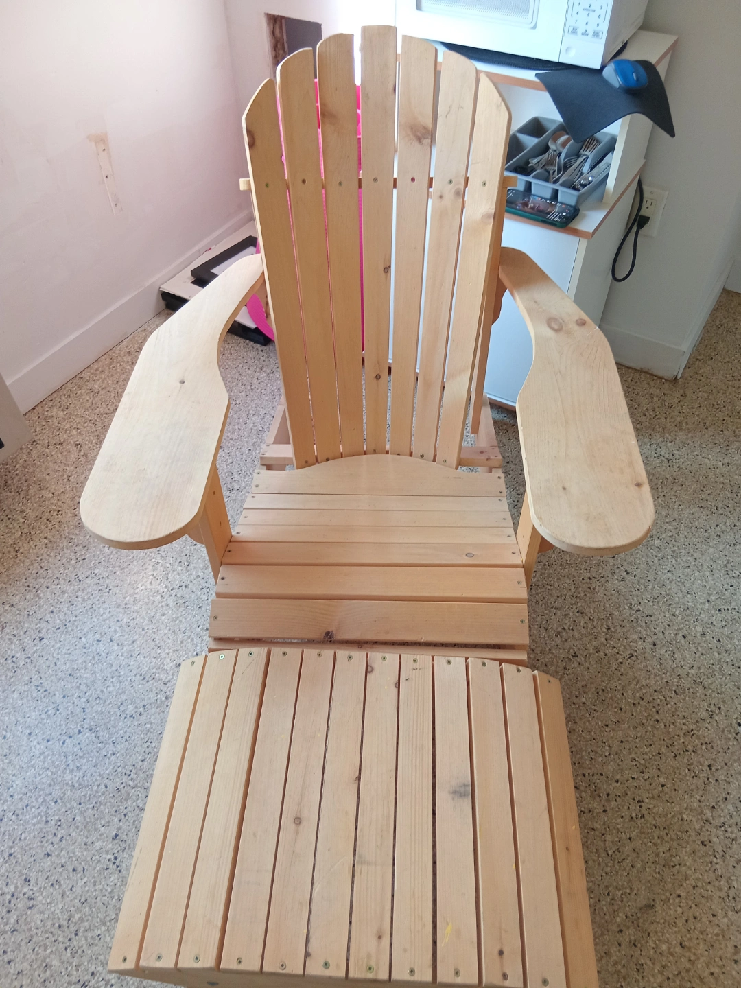 Relaxing Adirondack chair. Features a comfortable design and built-in footrest. Made of light-coloured wood. Perfect for patios or gardens.