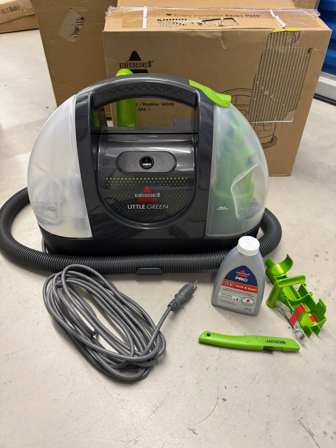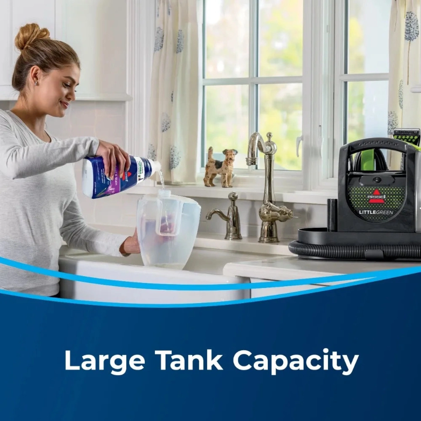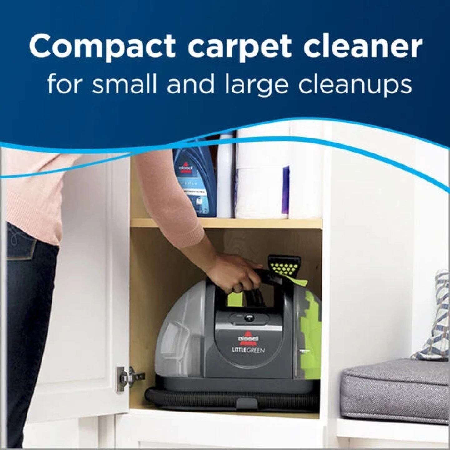 The Bissell Little Green is the ultimate portable carpet and upholstery cleaner, perfect for pet owners and households with high-traffic areas. This compact yet powerful cleaner is ideal for tackling both small and large messes on various surfaces, including upholstery, carpets, rugs, stairs, and even auto interiors. Equipped with strong spray and suction, it lifts and removes stubborn stains with ease.