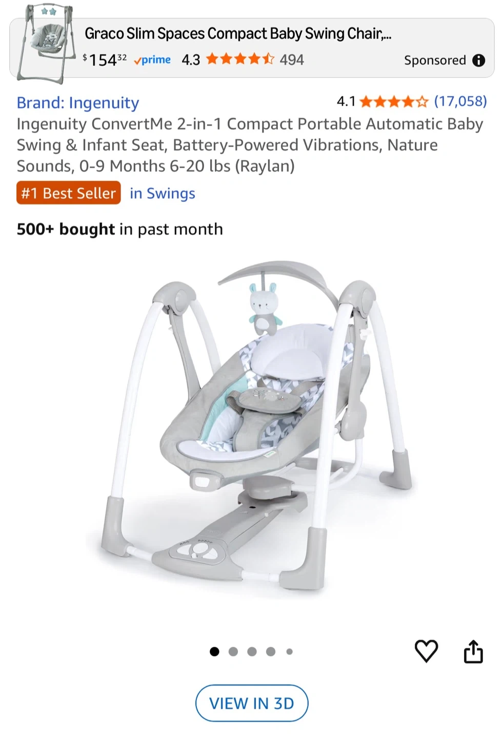 This Ingenuity baby swing and infant seat is battery-powered with vibrations and nature sounds. It's designed for babies 0-9 months, supporting 6-20 lbs. It folds flat for easy portability and storage.
