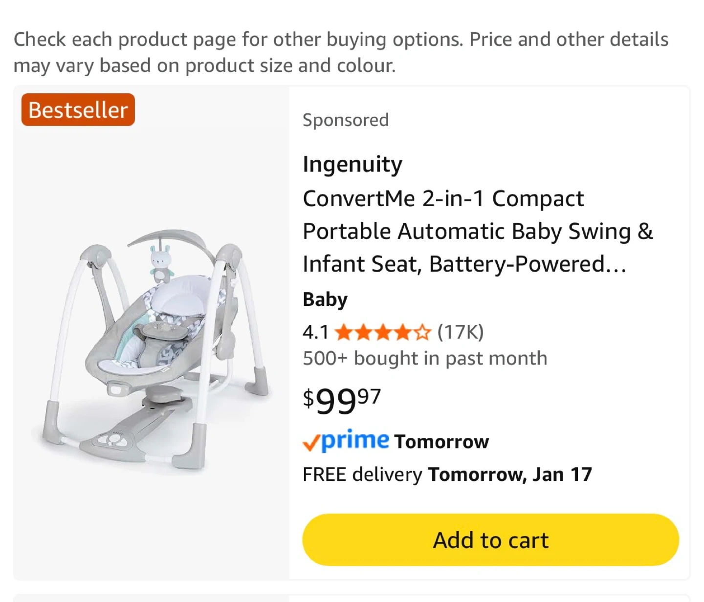 This Ingenuity baby swing and infant seat is battery-powered with vibrations and nature sounds. It's designed for babies 0-9 months, supporting 6-20 lbs. It folds flat for easy portability and storage.