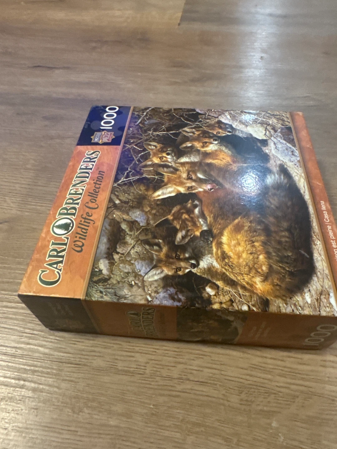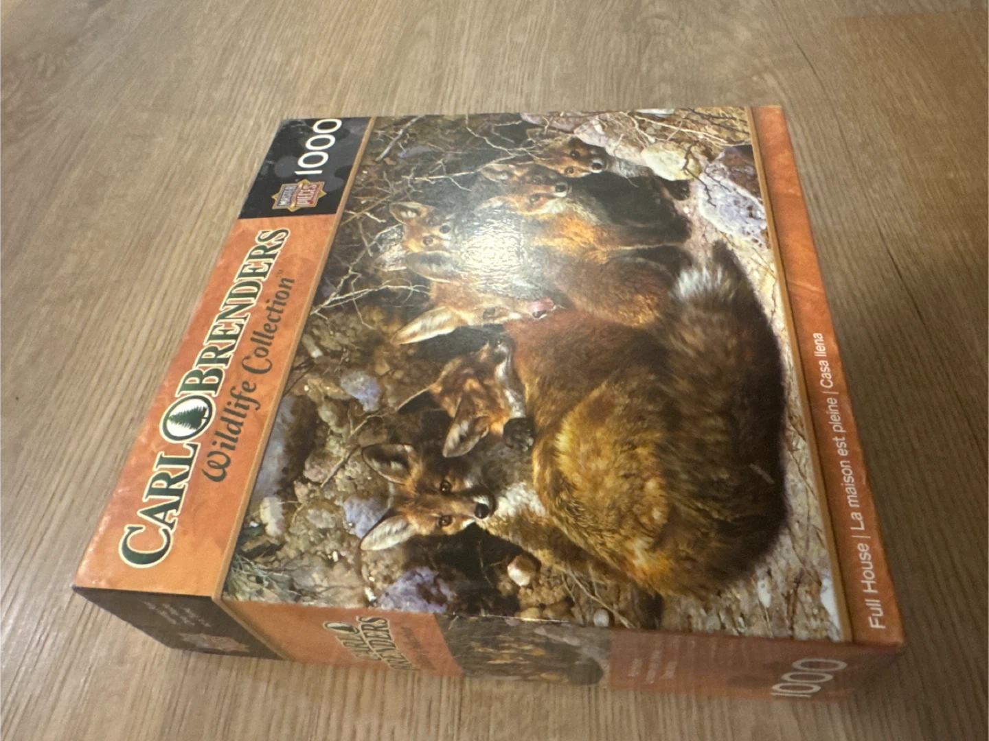 CARLO BRENDERS Wildlife Collection 1000 piece jigsaw puzzle. It features the artwork 'Full House' with a family of foxes. This puzzle is great for adults and nature enthusiasts looking for a challenging and rewarding activity.