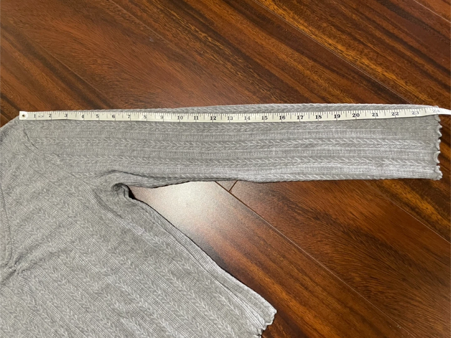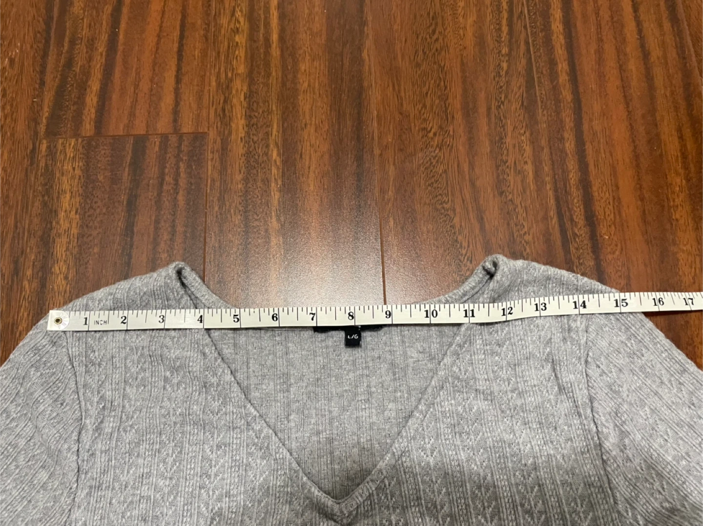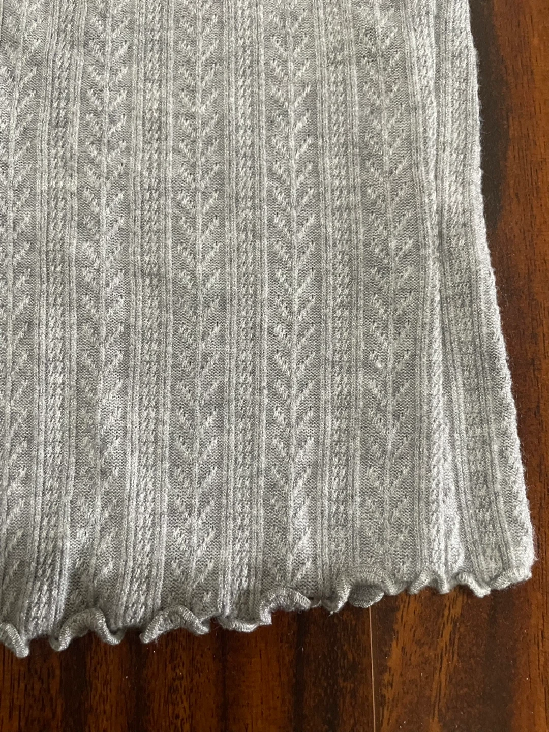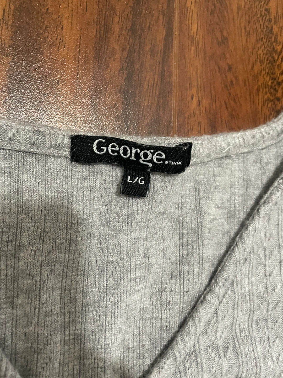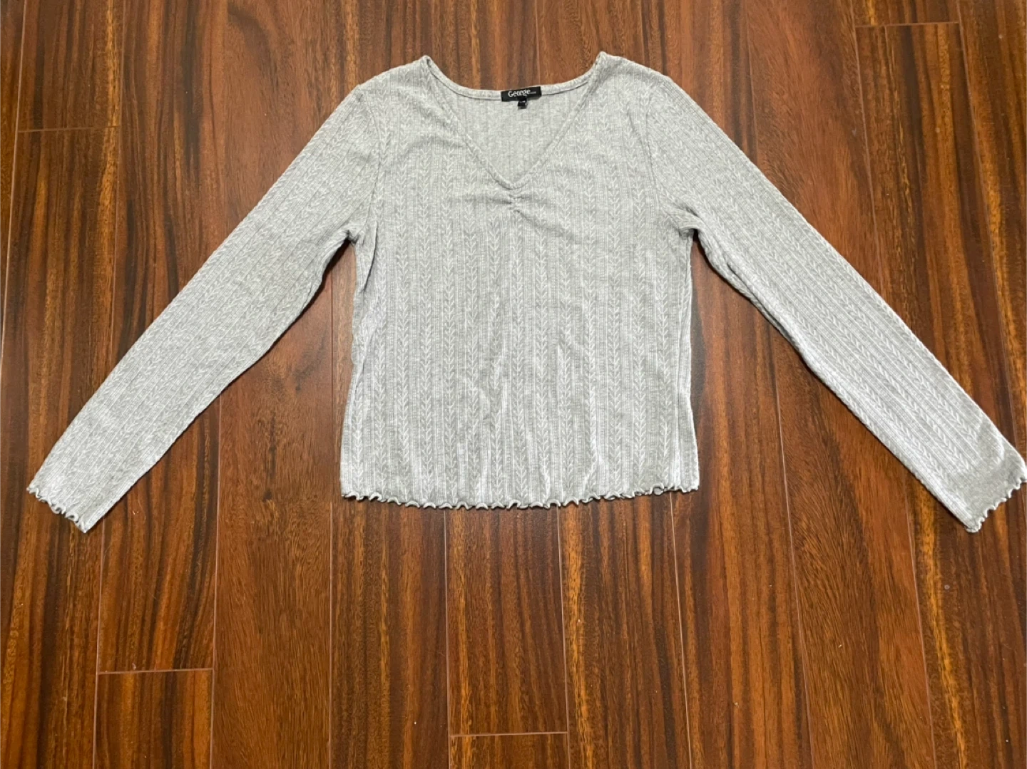 George long sleeve top in grey with textured stretch fabric. Ruched v neckline and lettuce edge trim at cuffs and hem. Fitted style. Excellent condition.