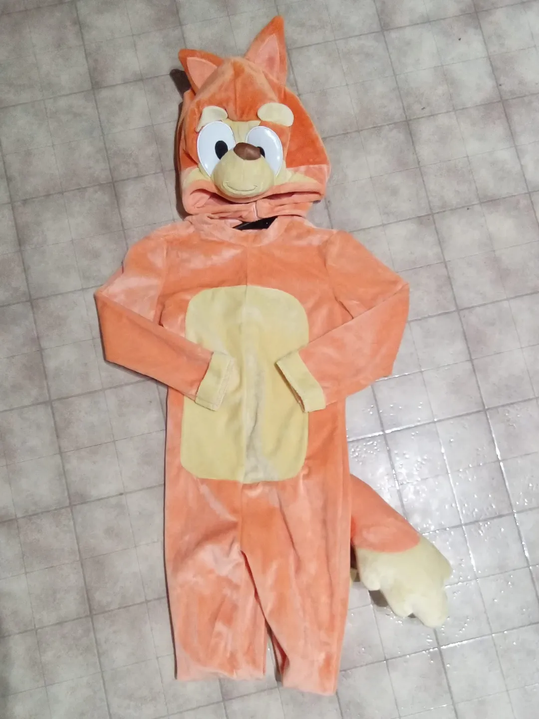 Fuzzy orange jumpsuit with a yellow belly and a hood. It has a tail and padded paws. Perfect for dress-up or Halloween fun! If interested please