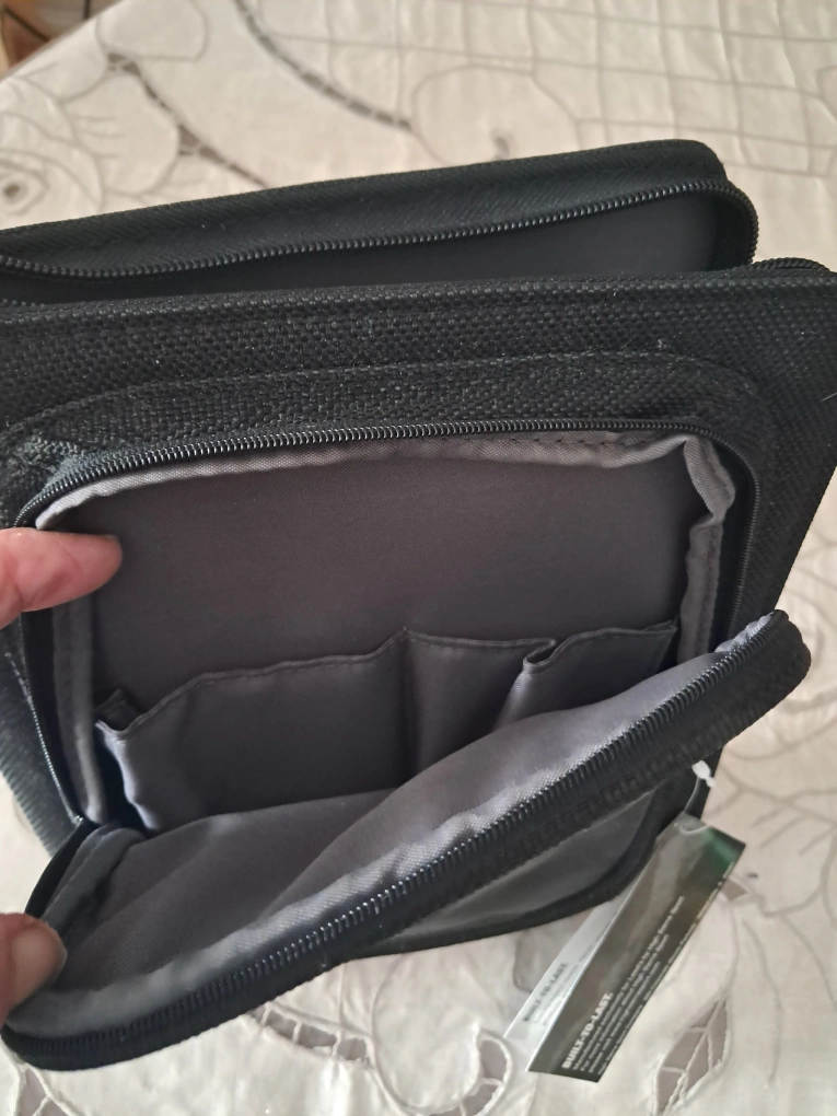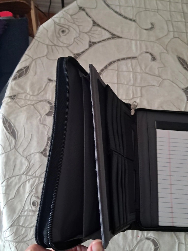 Black nylon zippered portfolio. Features several pockets and compartments for organization. Includes a notepad. Carabiner clip for easy attachment.
