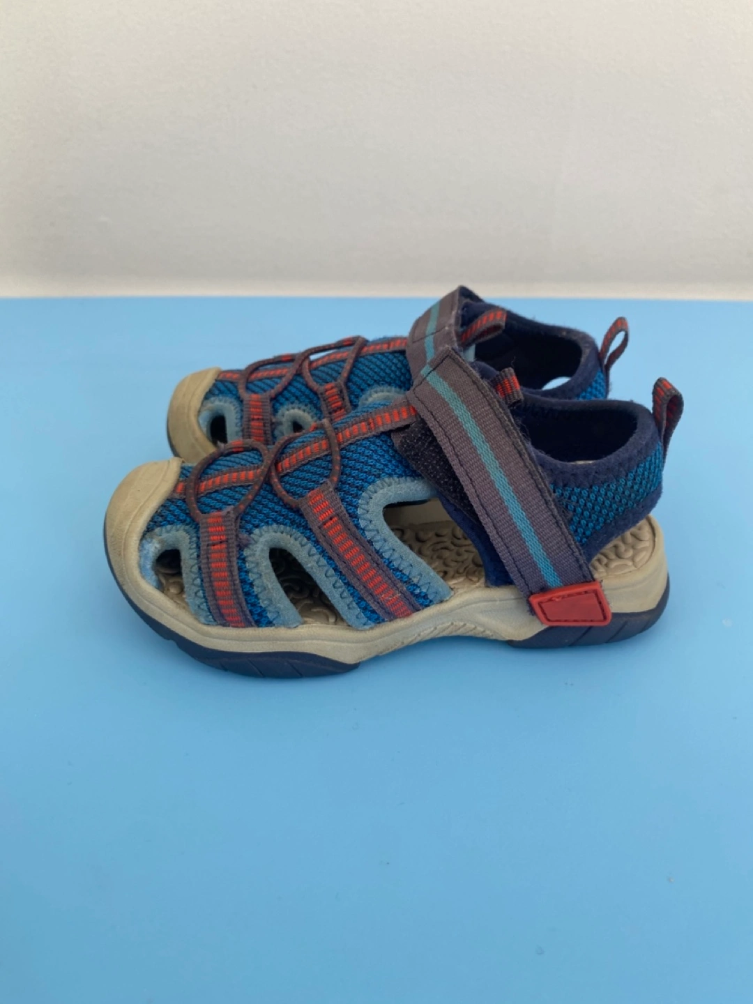 These are kids sport sandals in blue and red. They're designed for active outdoor wear. The soles offer good traction for various surfaces.