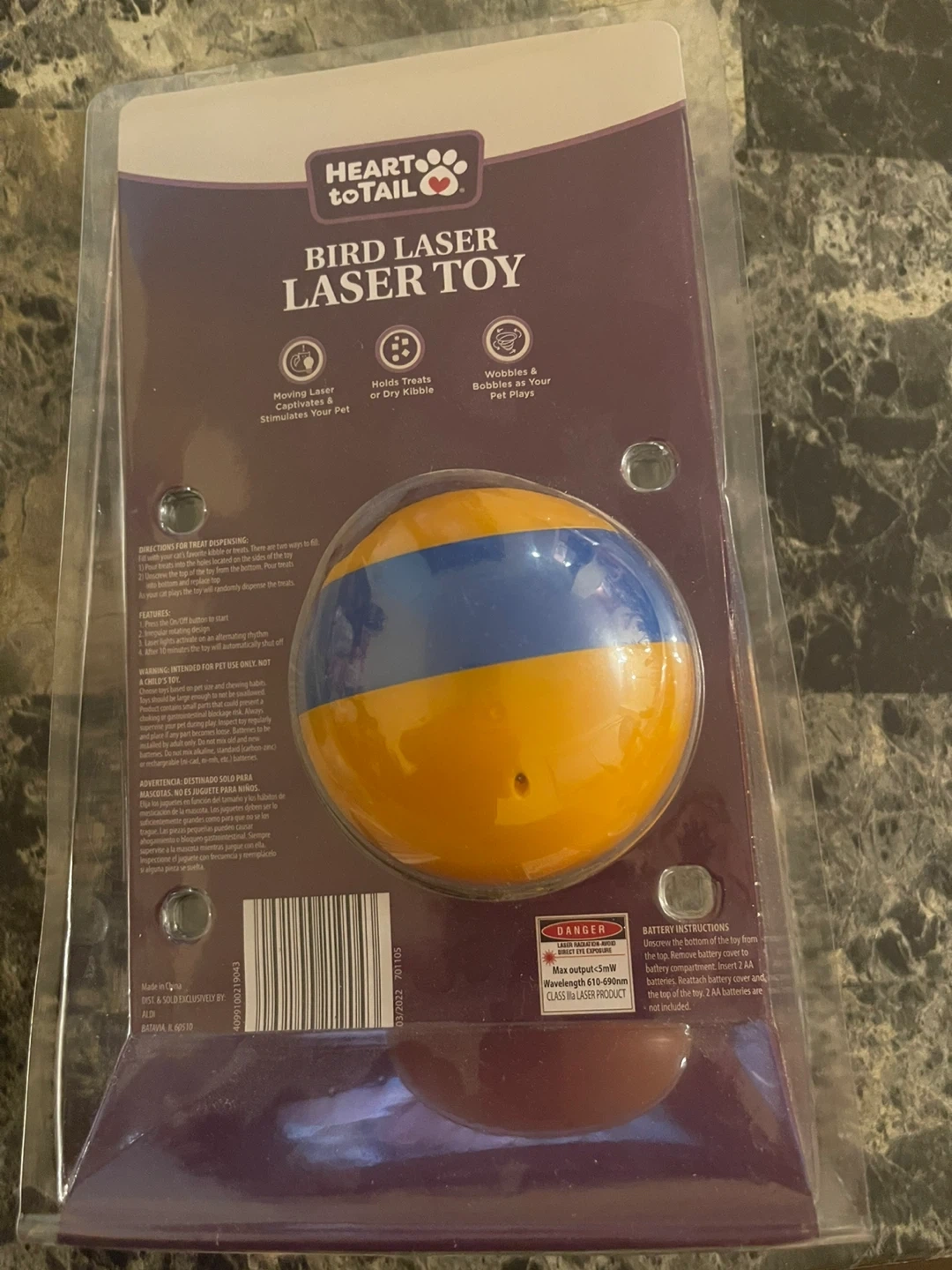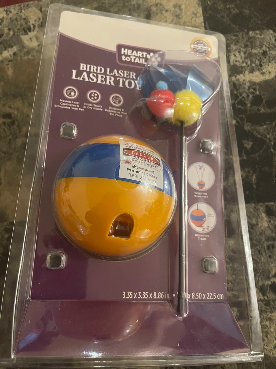 This bird laser toy stimulates your pet with a moving laser. It dispenses treats or dry kibble as your pet plays. The toy wobbles and bobs, and requires 2 AA batteries (not included). Price $15 negotiable