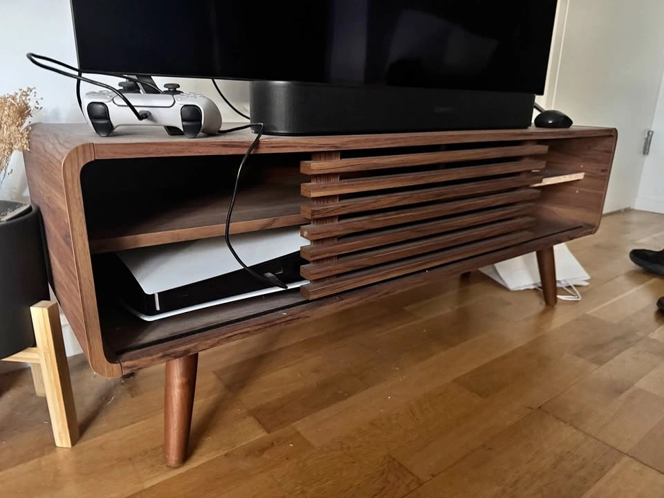 This Bria TV Stand from Mercury Row can accommodate TVs up to 50 inches. It's a stylish and functional piece for your living room. Let me know if you're interested!