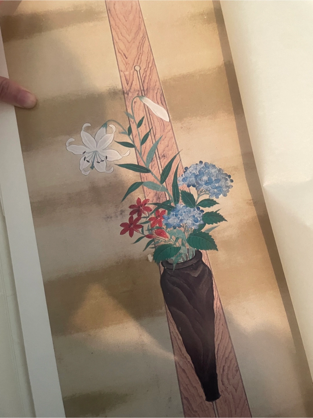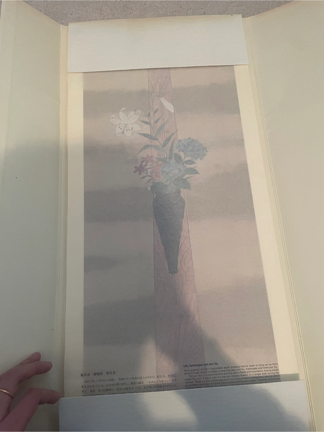 This is a collection of screen paintings featuring flowers in hanging vases. The images showcase lilies, hydrangeas, and other blossoms in a dark vase against a wood-like background. The artwork has a traditional Japanese aesthetic.
