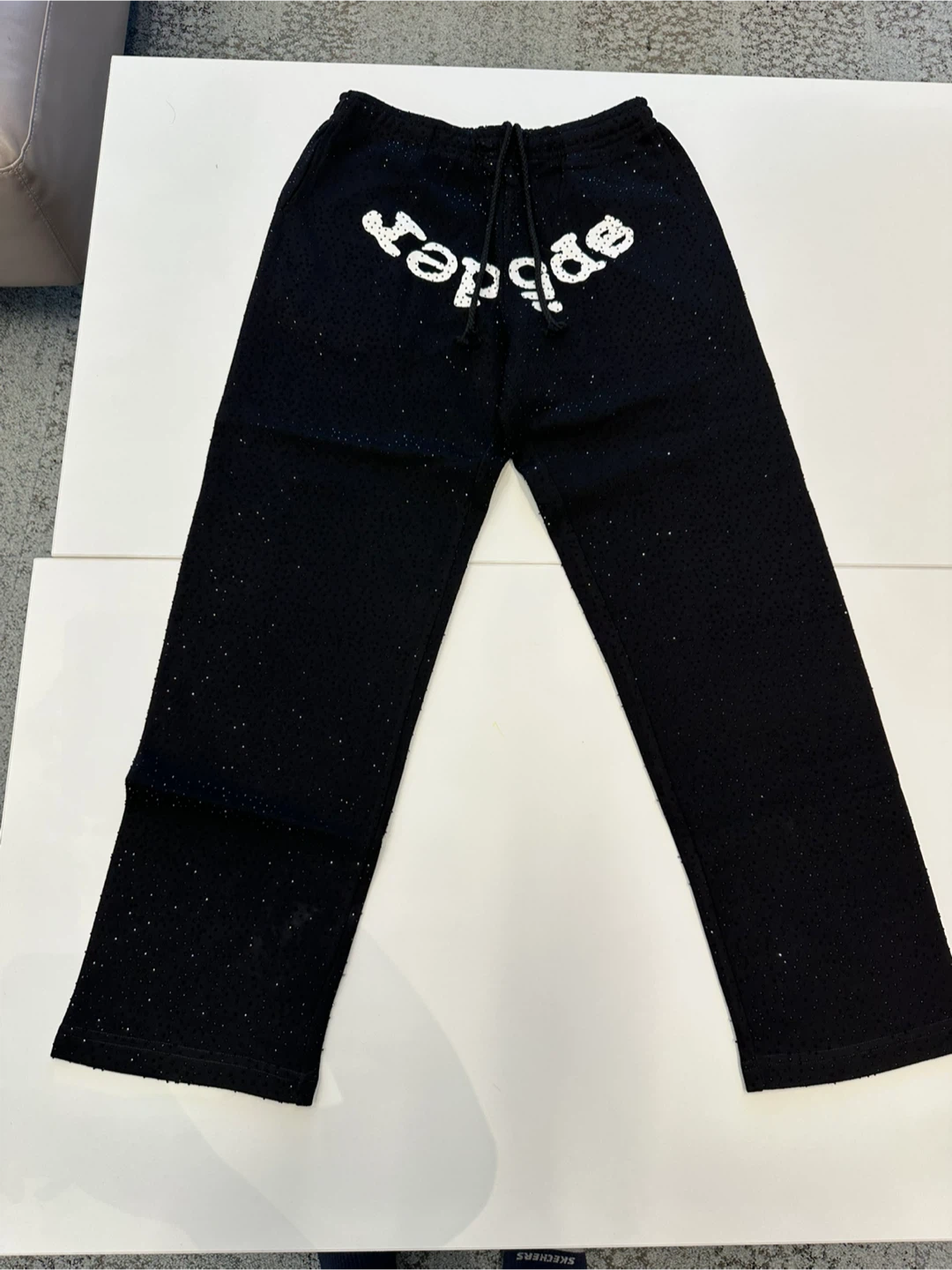 This is a black SPYDER tracksuit set featuring a hooded sweatshirt and matching pants. Both pieces have a perforated design and display the SPYDER logo. It comes with a drawstring bag for storage.