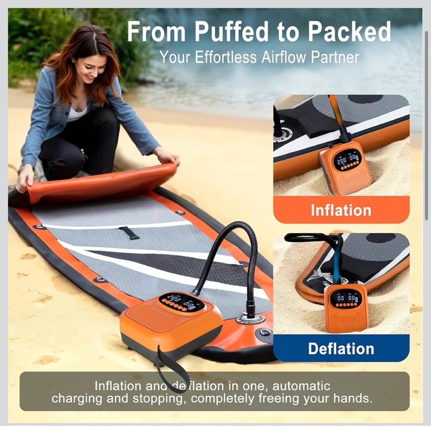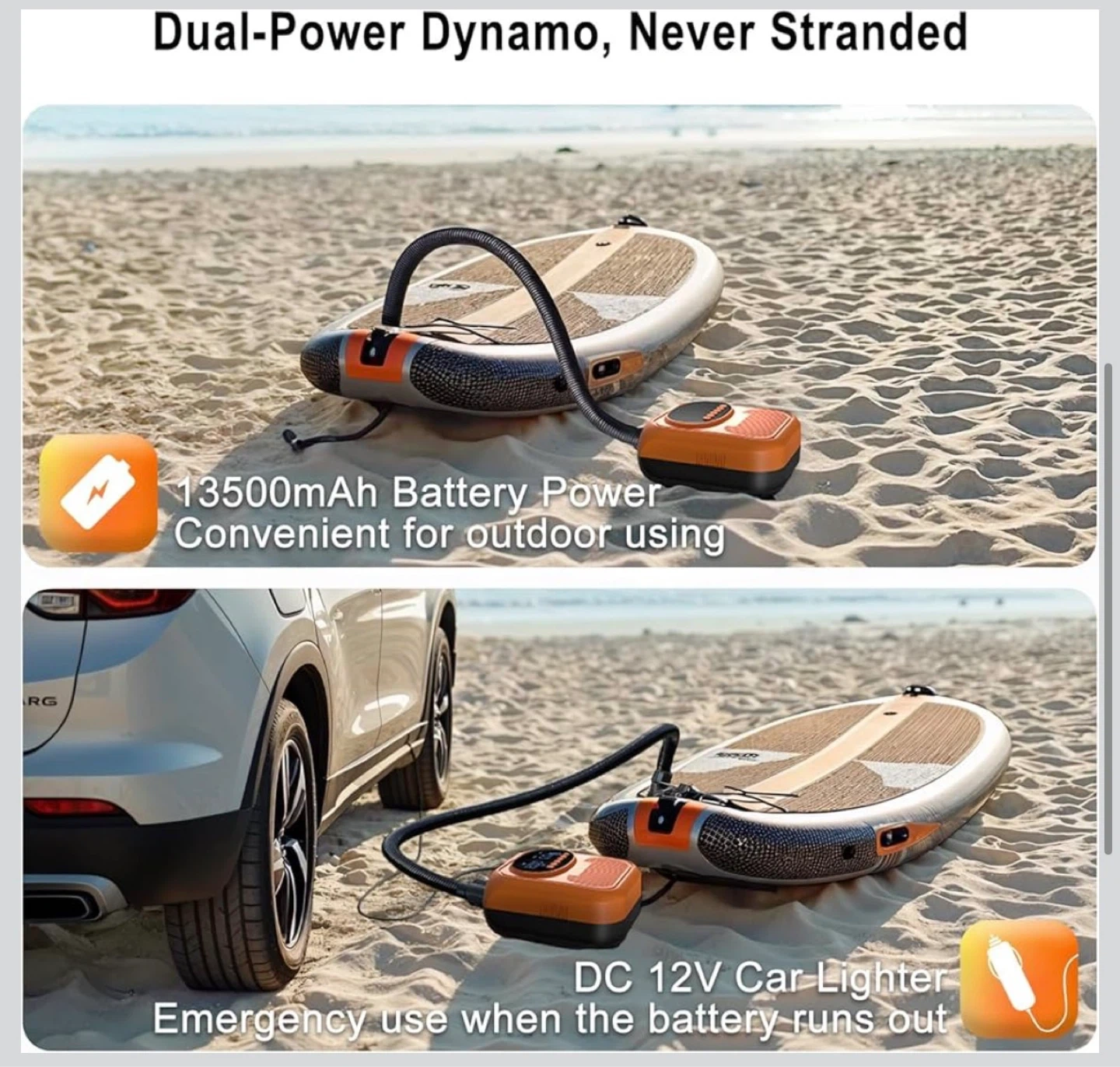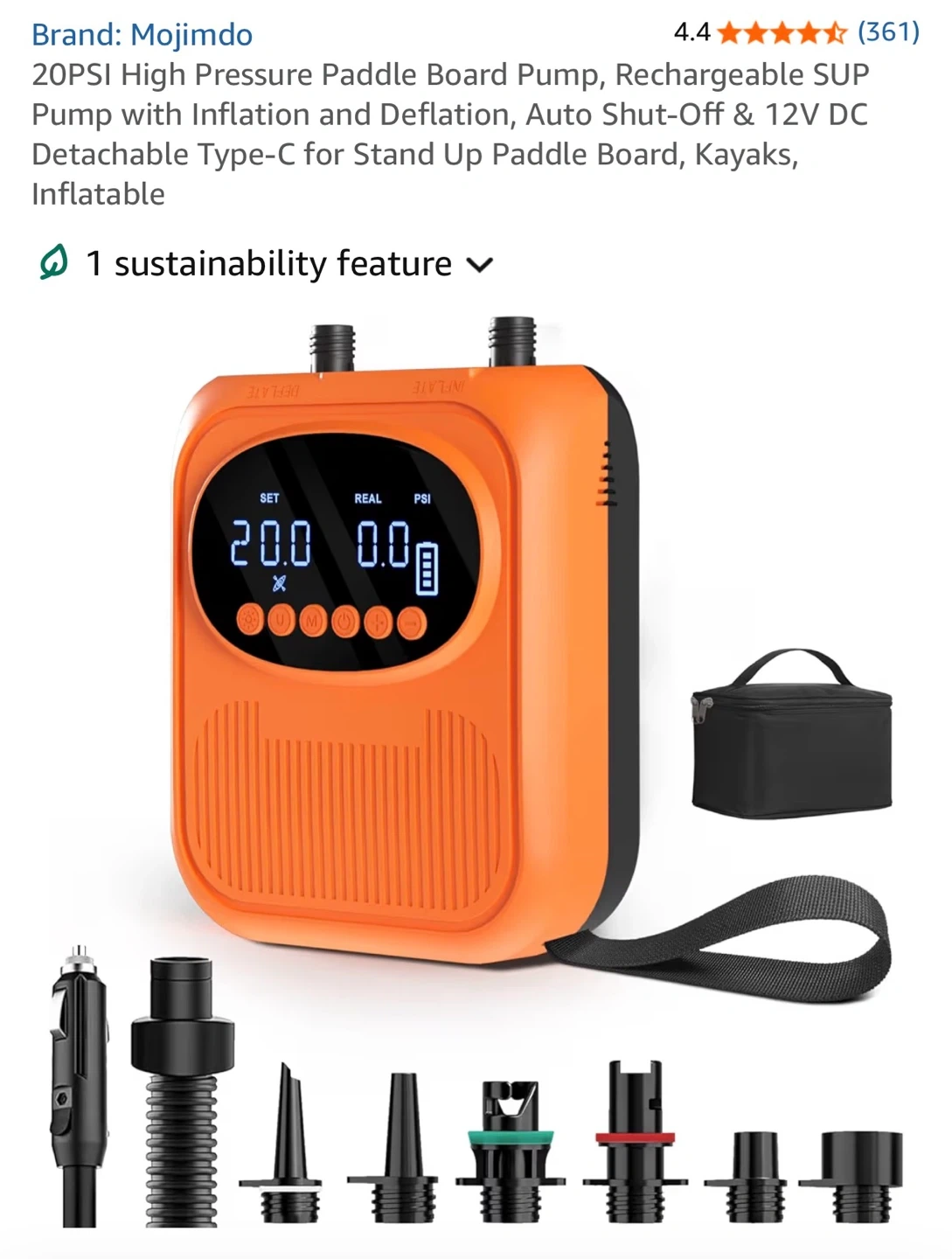 This Mojimdo SUP Pro Pump is rechargeable and offers up to 20PSI with auto shut-off. It features 400 L/min fast inflation and 100 L/min high pressure modes. It's detachable, Type-C, and 12V DC compatible, suitable for stand-up paddleboards and kayaks.