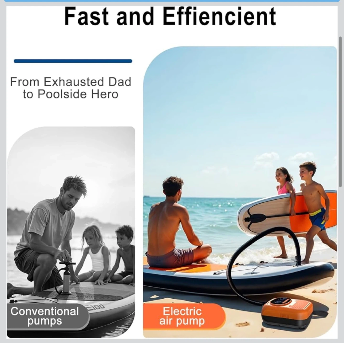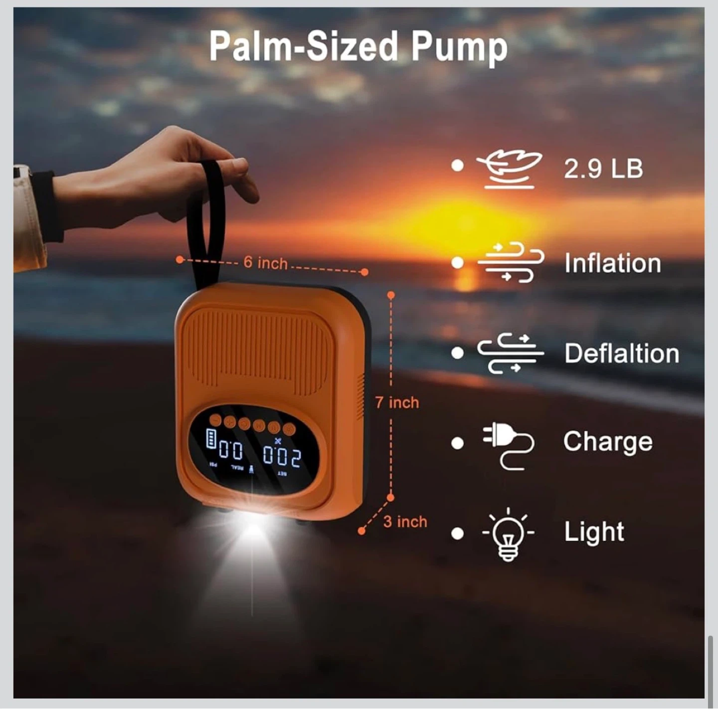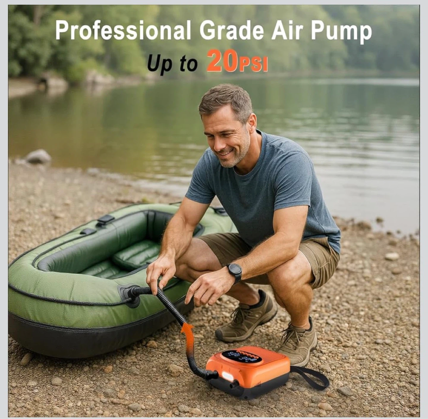 This Mojimdo SUP Pro Pump is rechargeable and offers up to 20PSI with auto shut-off. It features 400 L/min fast inflation and 100 L/min high pressure modes. It's detachable, Type-C, and 12V DC compatible, suitable for stand-up paddleboards and kayaks.